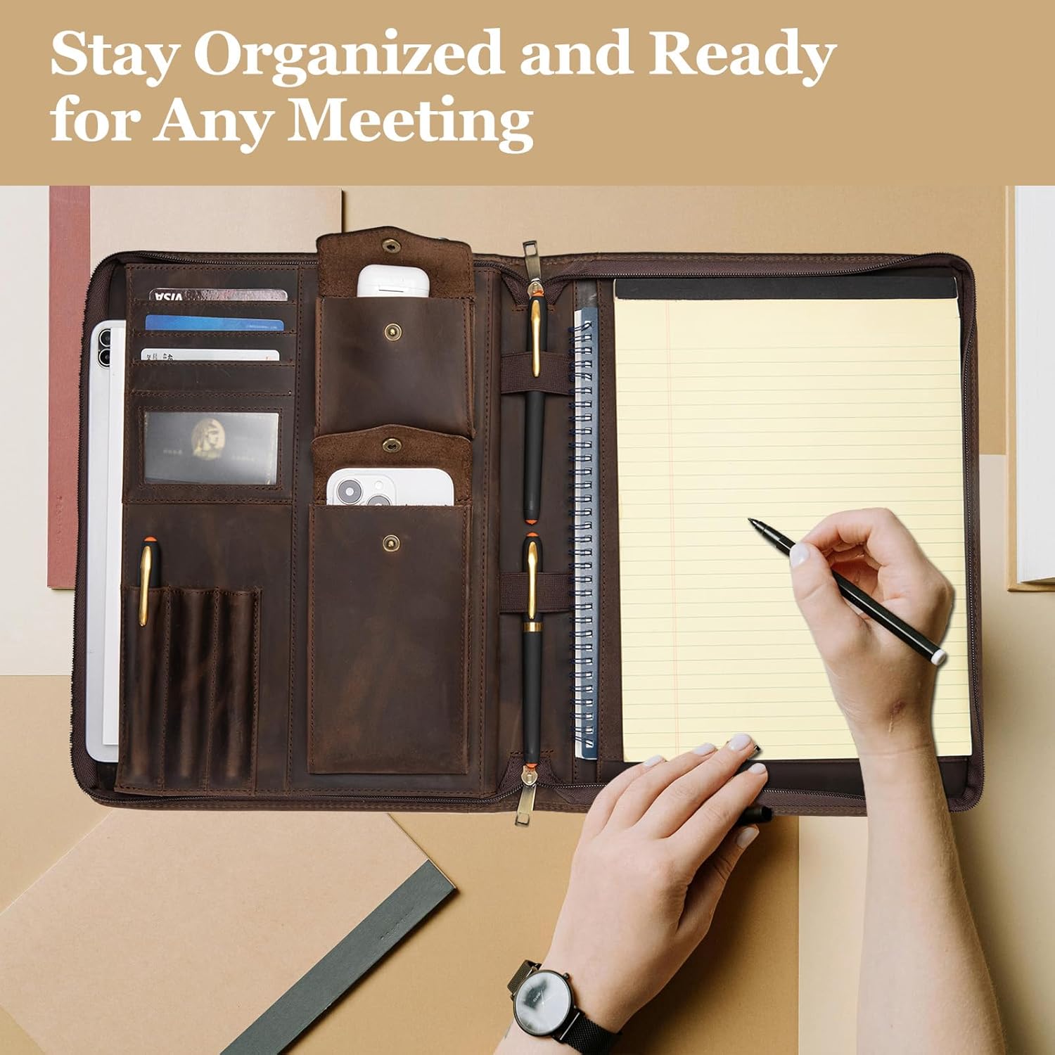 - A4 Notepad and 3 Pens Storage: A perfectly sized holder for Letter Size (8.5” x 11”) notepads. Stay organized and ready for any meeting or brainstorming session with 3 dedicated pen holders, ensuring you always have your favorite writing instruments on hand. Impeccably crafted, this portfolio effortlessly combines functionality and elegance, making it a must-have accessory for professionals.