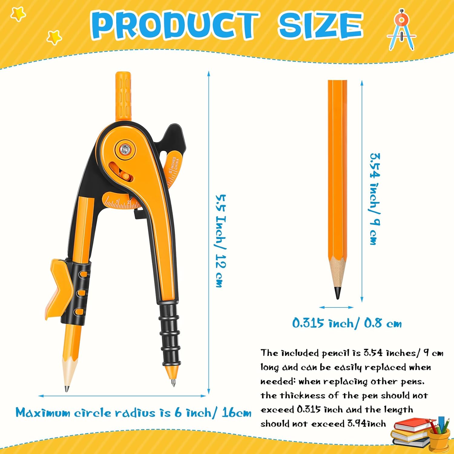 - Ideal Size: the 6 inches/ 15 cm math compass for geometry is ideal for varied applications; Each comes with a 3.54 inches/ 9 cm long pencil that's replaceable when required; The compass can draw circles up to 6.5 inches in diameter, houses pencils, markers, and pens up to 0.31 inches/ 0.8 cm in diameter, ideal for school projects and drawings