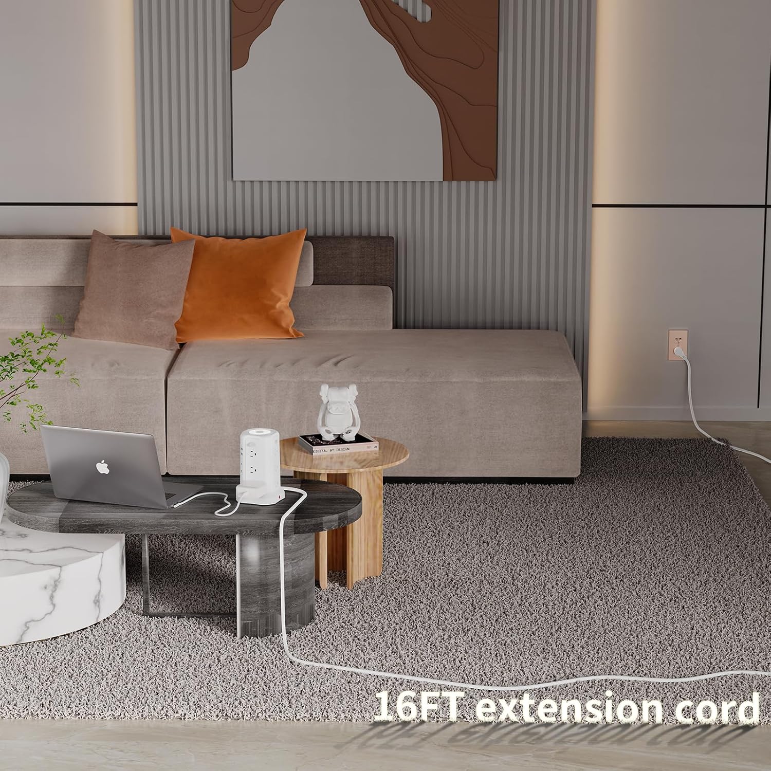 - 16 Feet Extra Long Extension Cord: This multiple outlets charging tower power strip has a 45° flat plug and 16 ft long cord. The long extension cord cable is flexible enough that can fit easily into hard-to-reach places behind your bed or sofa in a long distance.