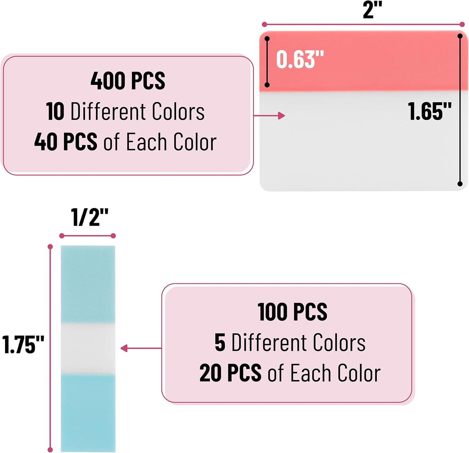- Package includes 500 pieces of sticky tabs in 21 sets, 400 pieces of 2-inch tabs in 20 sets with 10 different colors, and 100 pieces of 0.5-inch tabs in 1 set with 20 pieces of each color.