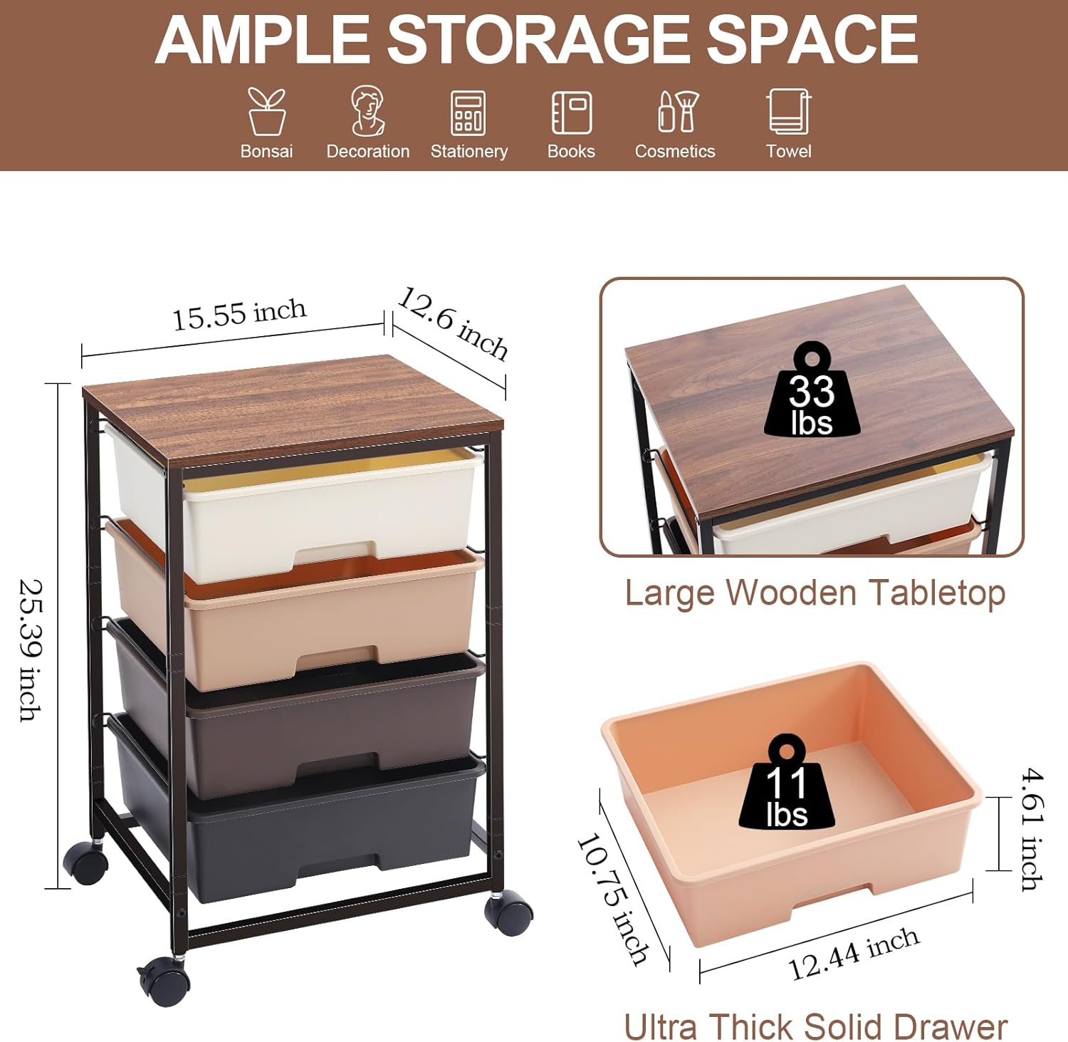 - AMPLE SPACE FOR STORAGE & CLASSIFICATION: The overall size of this storage cart with drawers is 15.55"D x 12.60"W x 25.39"H. Wooden tabletable top allows you to put plants, paper cutting printer,printer and other decorations.