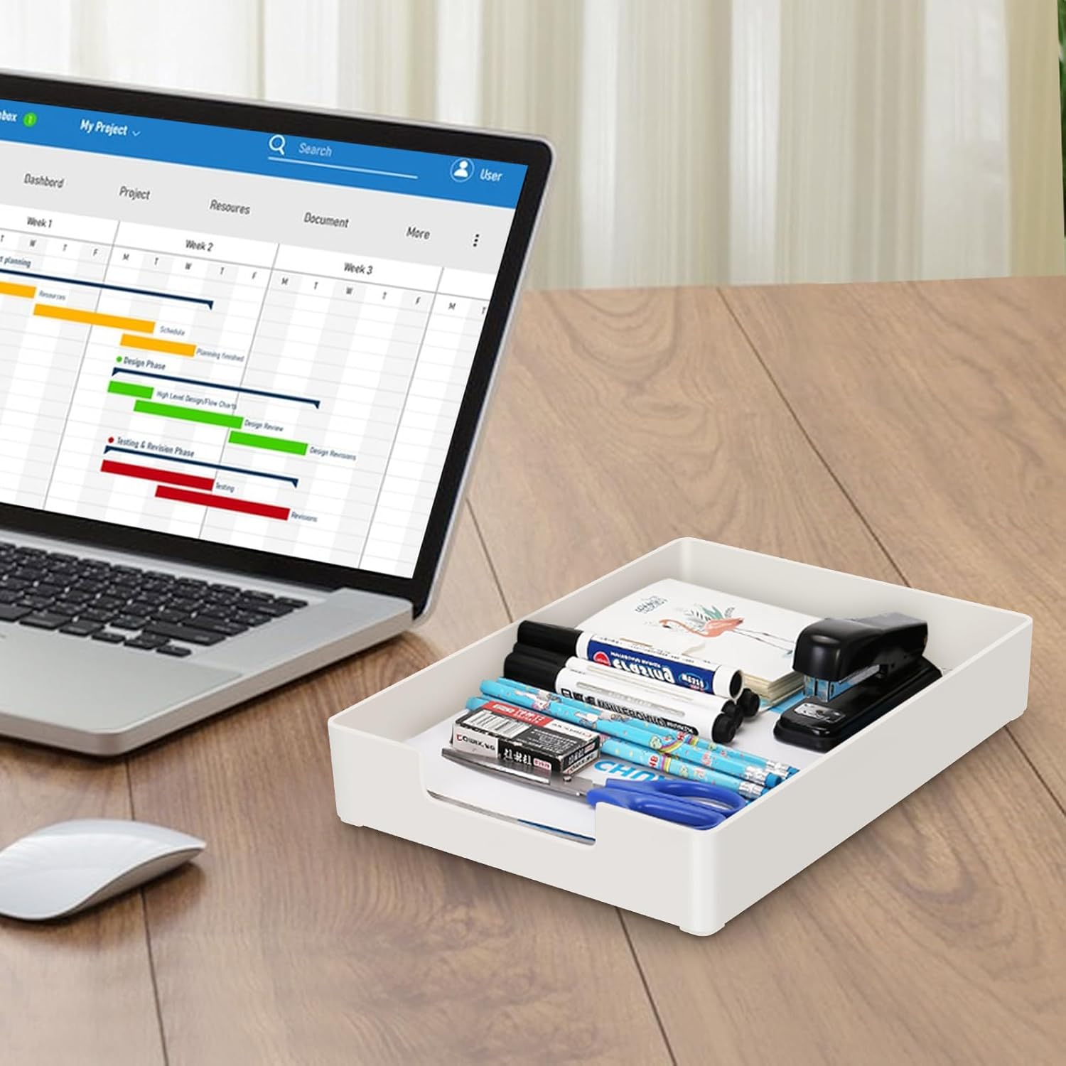 - Simple & Classic Desk Paper Tray: Our white paper organizer tray adopts a simple but classic design. A large tray without dividers inside ensures that you can freely arrange any of your desktop accessories. Clean, elegant, smooth lines and curves make it a beautiful decor for your desktop. Whether you place it on a desk or shelf or inside a drawer or cabinet, it will look great. Never out of Style!