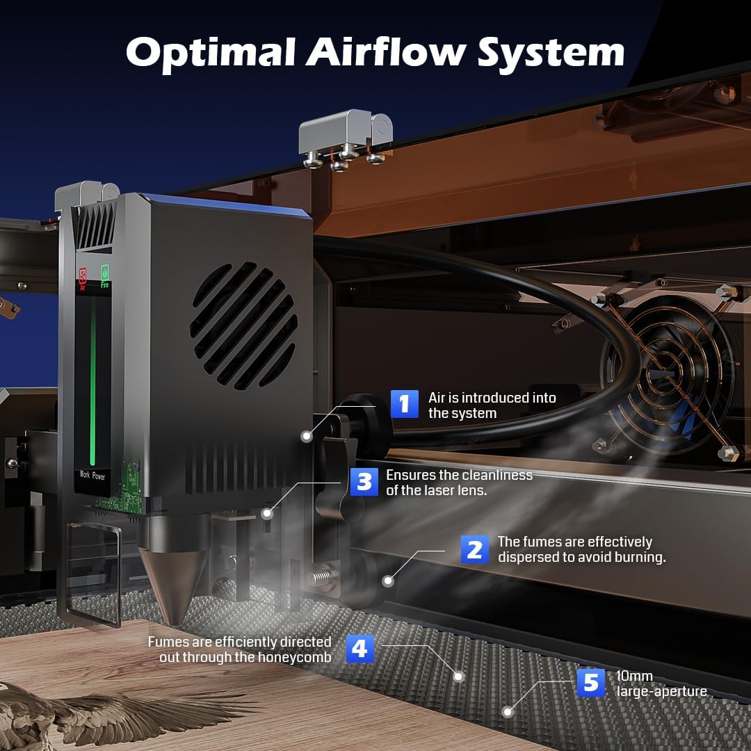 - Say goodbye to multiple trials and errors: equipped with a Lightburn-compatible camera, positioning your project is a breeze. Plus, with a power indicator bar, fault reporting light, and airflow detection, this machine puts you in control.