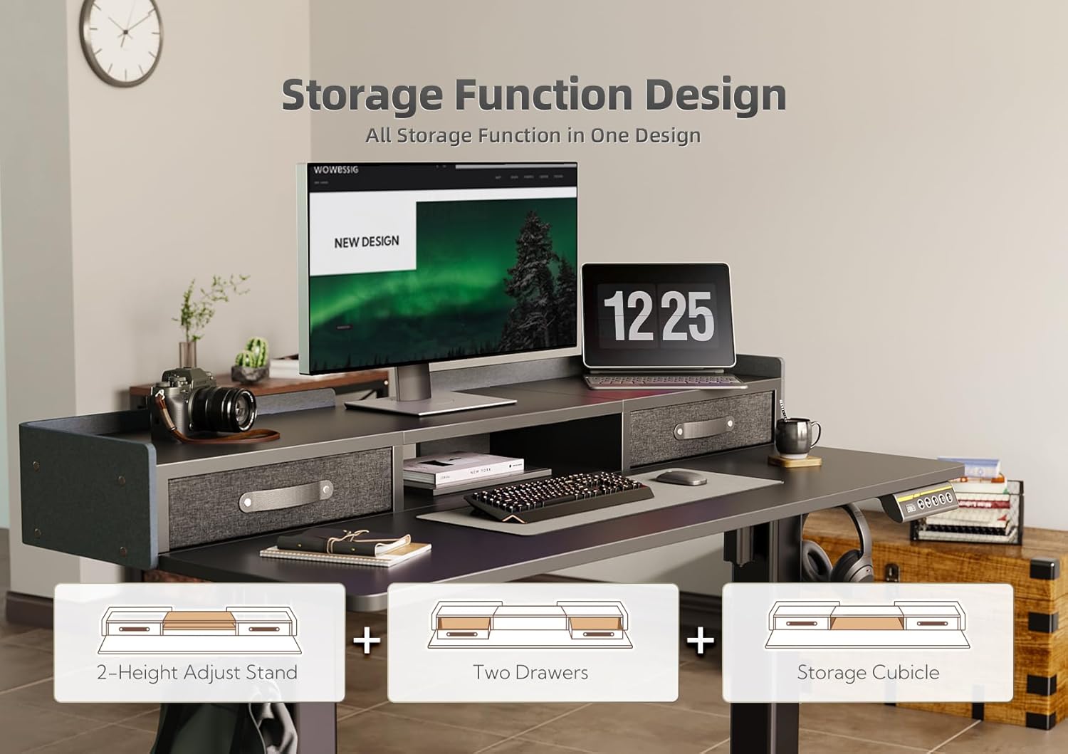 - 2-Drawers for Storage - Adjustable stand desk with drawers. 2 tabletop drawers provide more storage & organize space for a variety of home office tasks. The desk comes with a hook, drawers, and felt fence, which provides more home office desk usage possibilities.