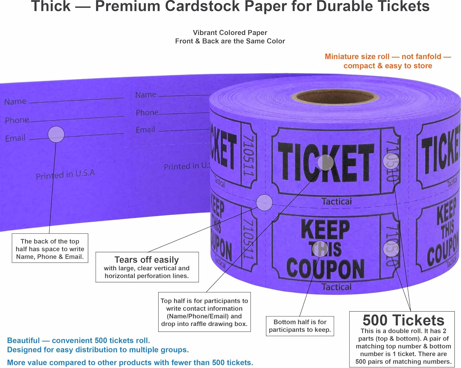 Tacticai 500 Raffle Tickets, Purple (1 of 8 Colors), Double Roll, Ticket for Events, Entry, Class Reward, Fundraiser & Prizes