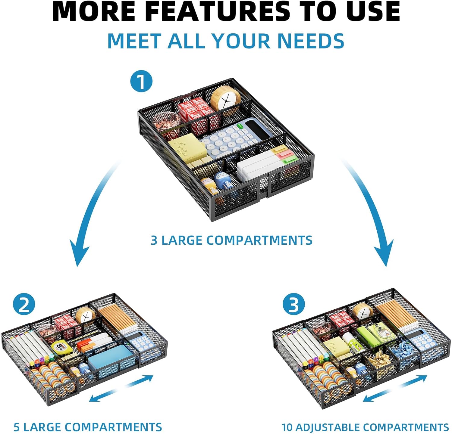 - 【Adjustable Dividers】: Our drawer organizer features 4+1 removable dividers. You would configure the size for fit varisized desk accessories, such as pens, erasers, highlighters, notes, staplers, tapes, clips