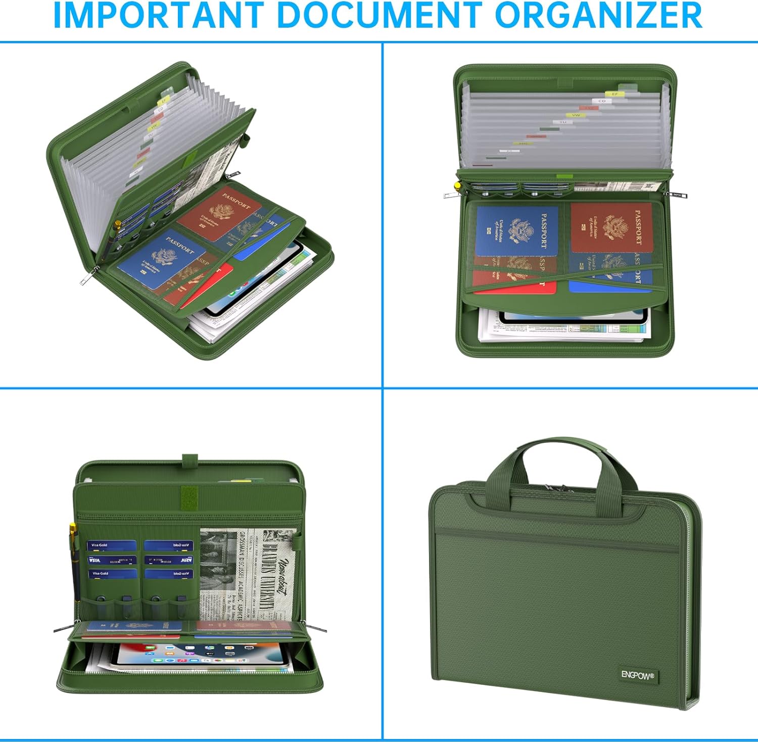 - Accordion File Organizer: A Safe Enough Folder to Keep Your Files. Say goodbye to cluttered files and disorganization with ENGPOW's file organizer folders. Compared with other folders,our fireproof folders is allows you to neatly store and classify letter/A4 files, receipts, cards, USB drives, pen, passports and more in a safe and orderly way. Perfect for daily file filing and storage.The Non-dusty material can prevent dust from sticking to the outside of our folder,always keep it neat and tidy.