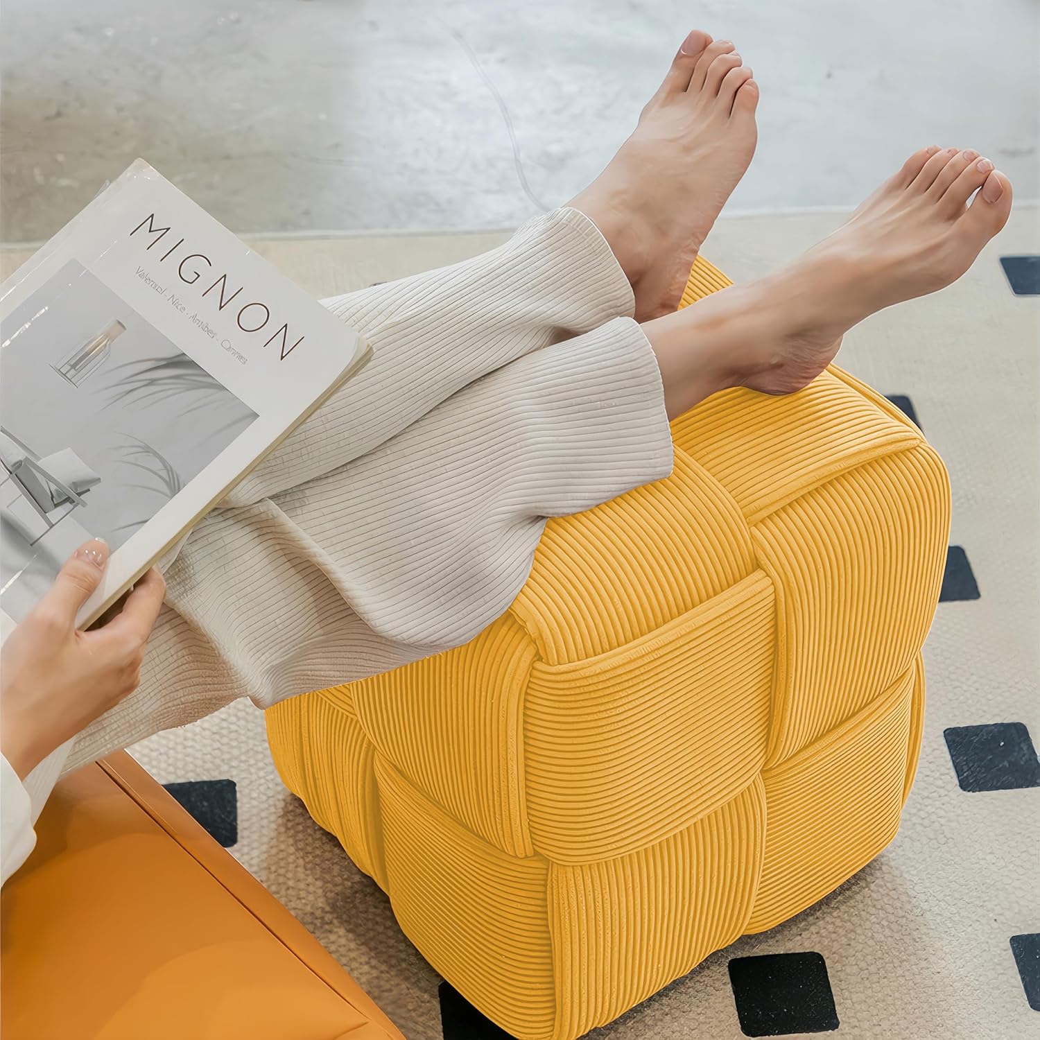 Ottoman Foot Rest Soft and Comfortable Ottoman Square Corduroy Woven Design Sofa Stool (Yellow)