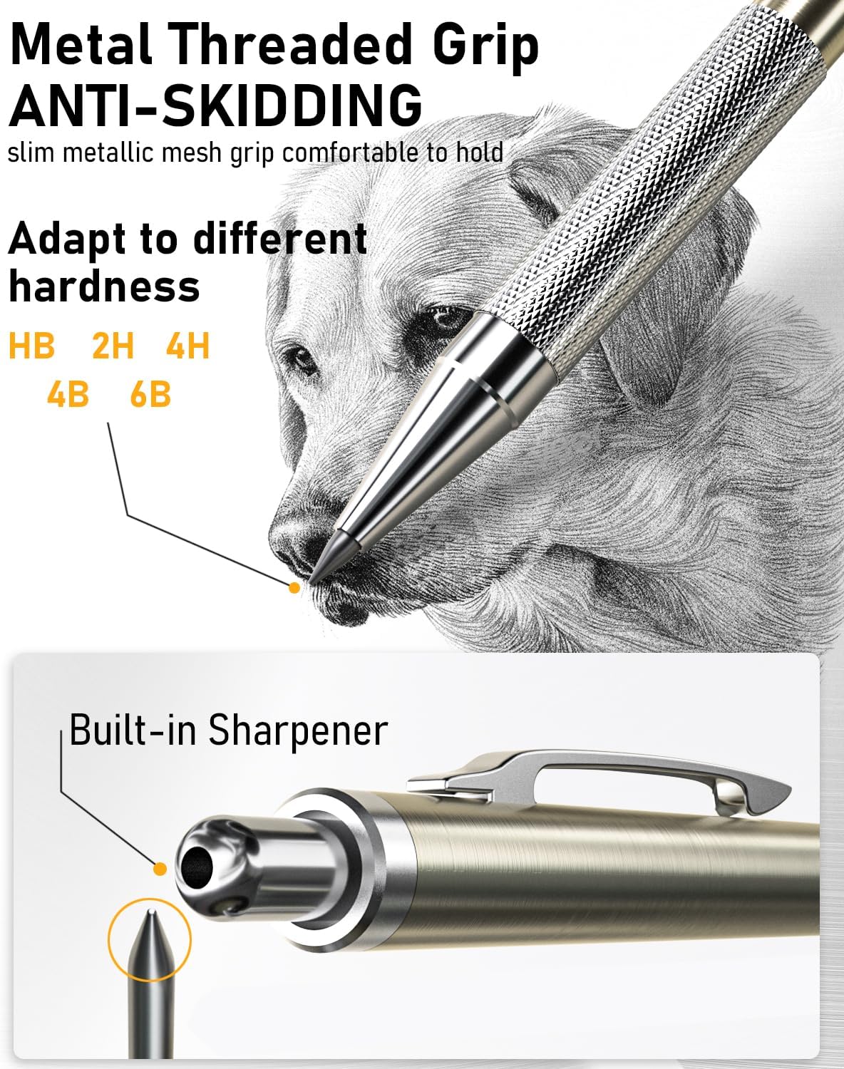 - 2 PCS 2mm Lead Holder: Metal Threaded Anti-skidding pen tube, feature a lead sharpener design, allowing you to sharpen the pencil lead at any time.The 2.0mm graphite leads are available in 6B 4B 2B HB 2H 4H and colors, perfect for sketching in different shades and drawing skill