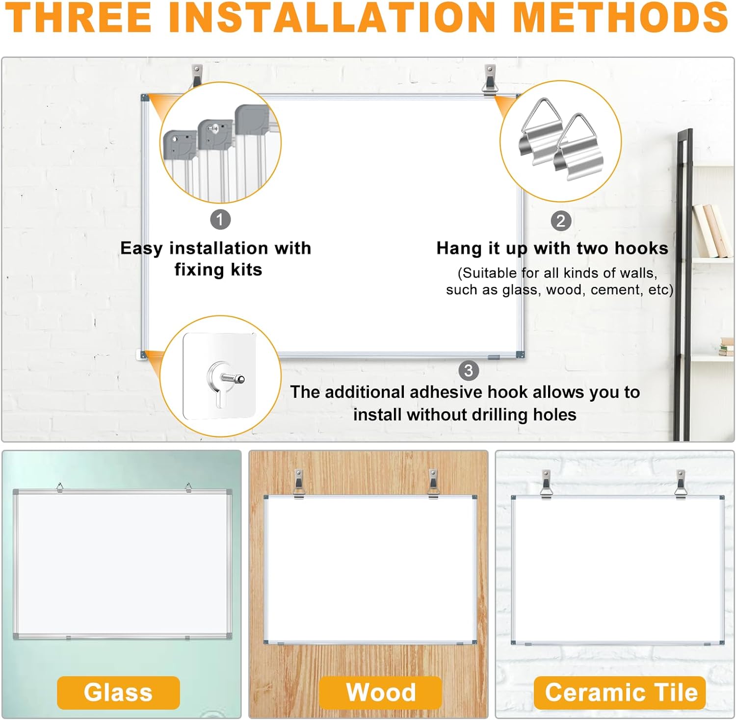 - Three Installation Ways: ★ Drill holes in the wall, you can use the screws in the mounting kit to mount it; ★★ If it's not convenient to drill holes in the wall, you can use hooks on the whiteboard to hang it on the wall, the movable hanging hooks allow you to adjust hanging distance easily. ★★★ Or you can hang it on the wall with our complimentary adhesive hooks.