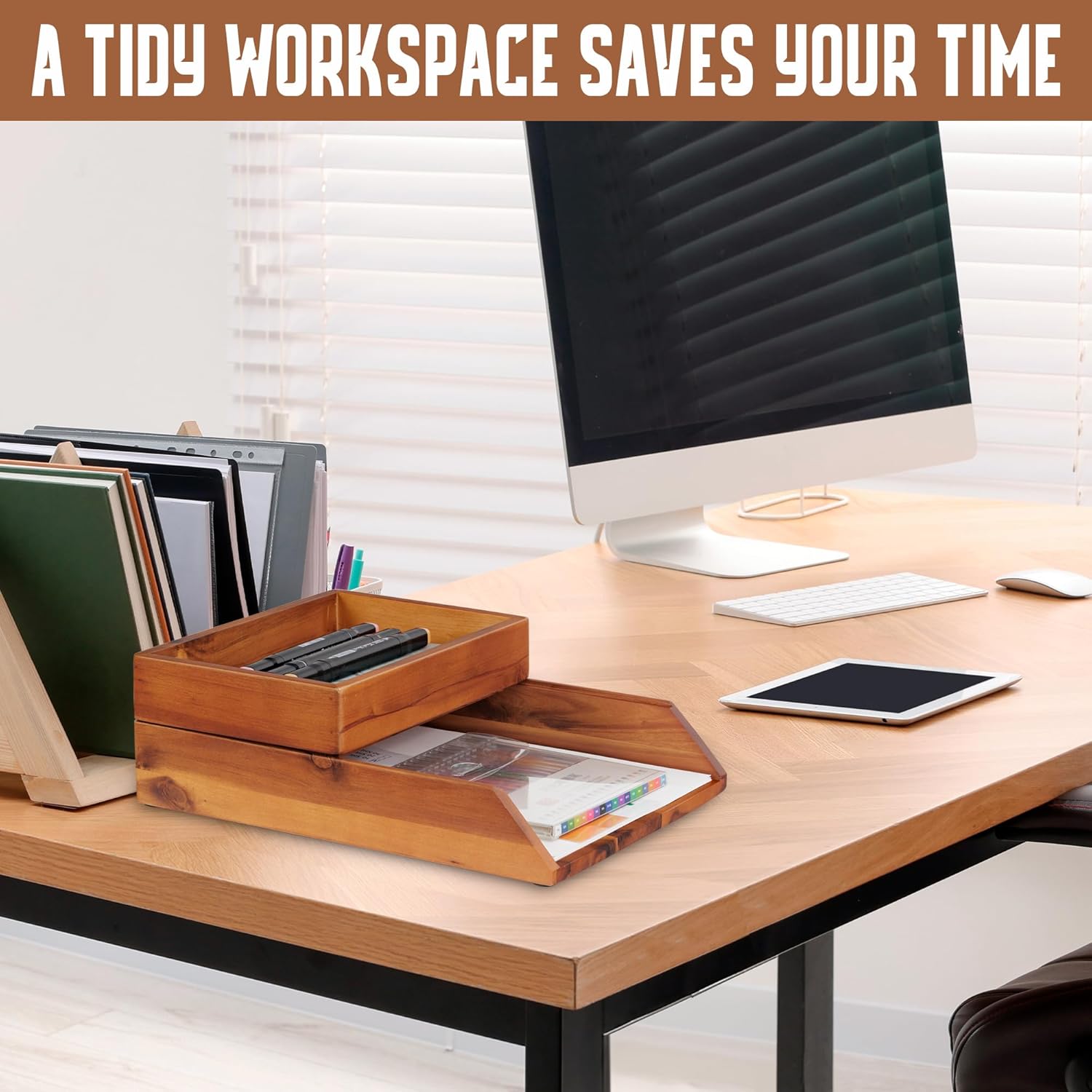 Demigo Desk Organizer Letter Tray Set of 2, Acacia Wood Tabletop Desktop for Storage Paper Letter Folders Notebooks Copy Print, Workspace Holder, Keep Stationery Saver (Brown)