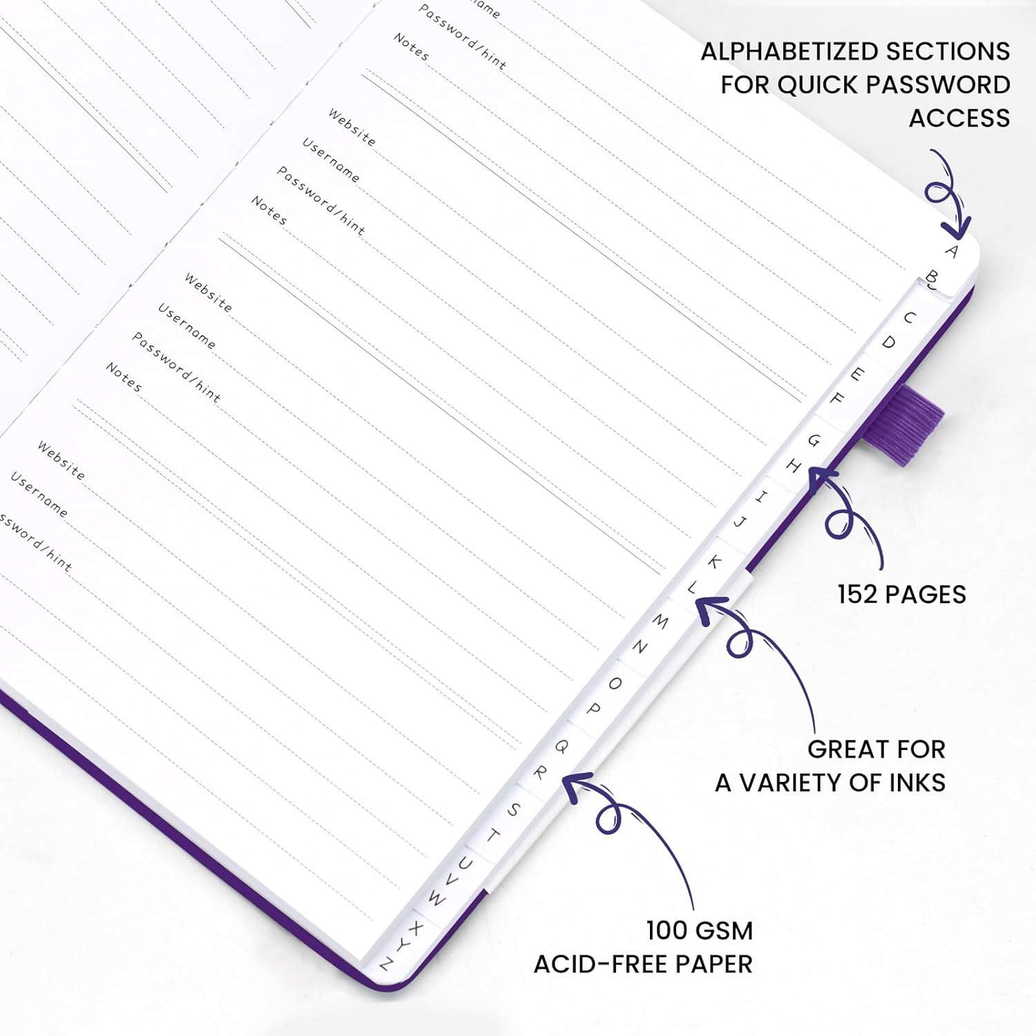 - 【Alphabetical A-Z Tabs】Each tab has 6 pages with 4 entries per page and can contain more than 576 passwords. The alphabet label system makes it convenient to record the passwords you need. Logs also have room to write important data, wireless and email settings, software license information, and additional notes. It provides separate pages for your most important websites, so you can access them quickly.