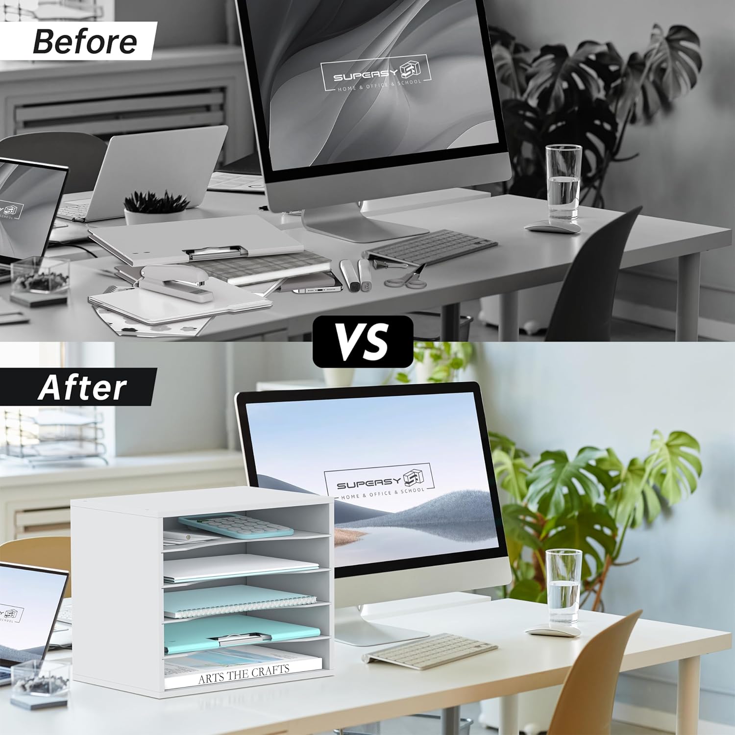 - [Space-saving] SUPEASY 5 tier white desk organizer is large enough to hold all your important papers, files, mails, letters, books, magazines, documents, etc. The top surface area of the 5 tier paper tray is suitable for desk decor. It is also a perfect printer stand with paper holder for some portable printer.