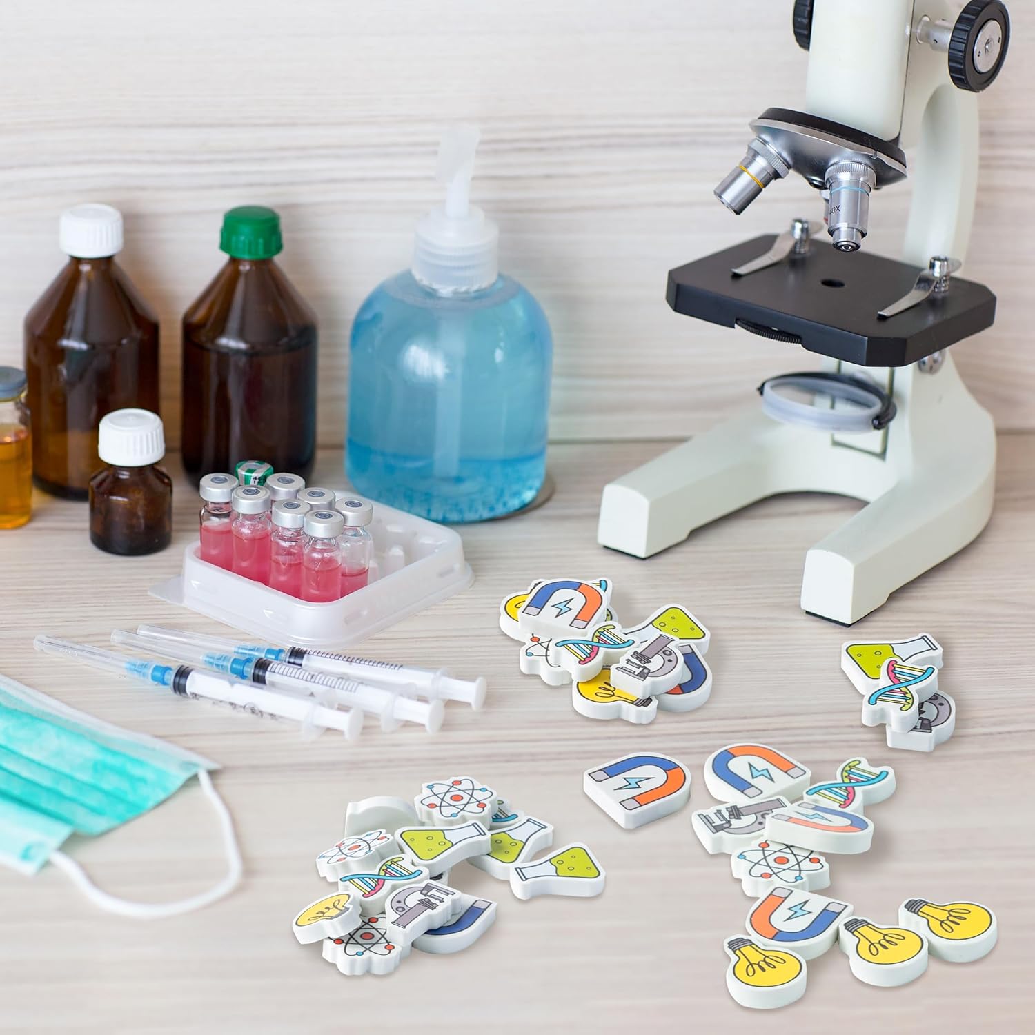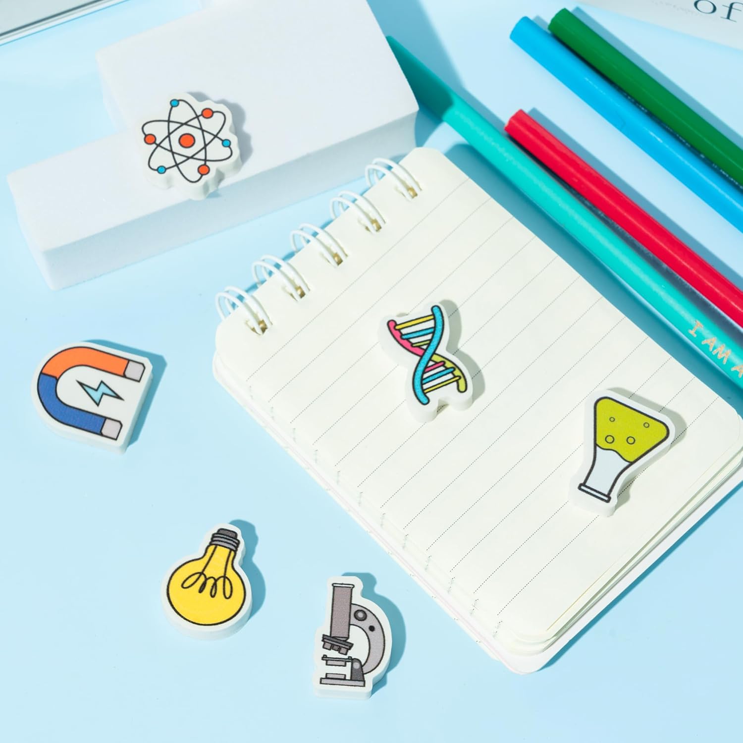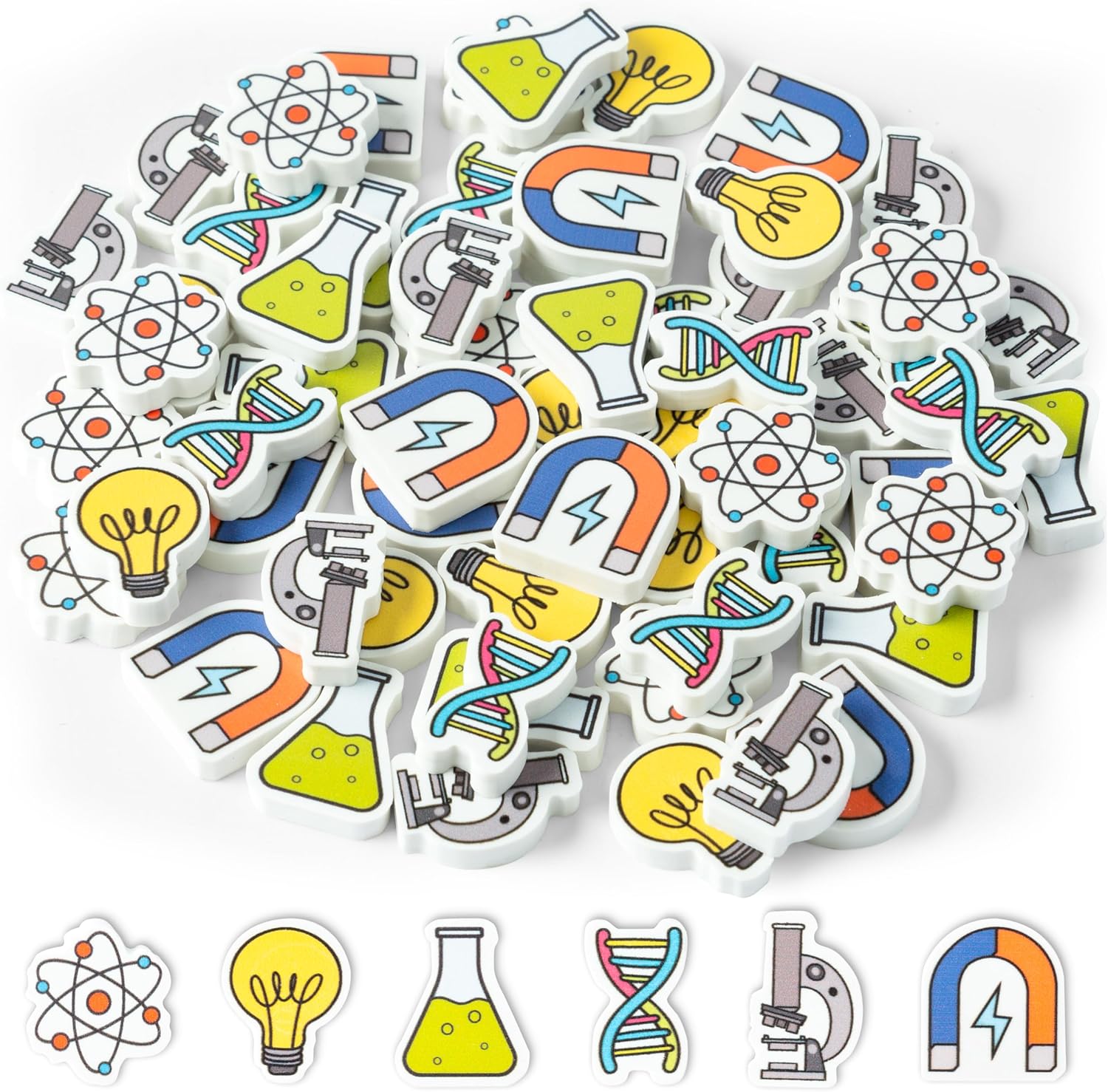 - Science Themed Eraser: This eraser uses chemical elements and has 6 patterns, including a microscope, U-shaped magnetic suction, DNA chromosome, light bulb, molecule, and test tube. It is suitable for students, teachers, and science enthusiasts as office supplies