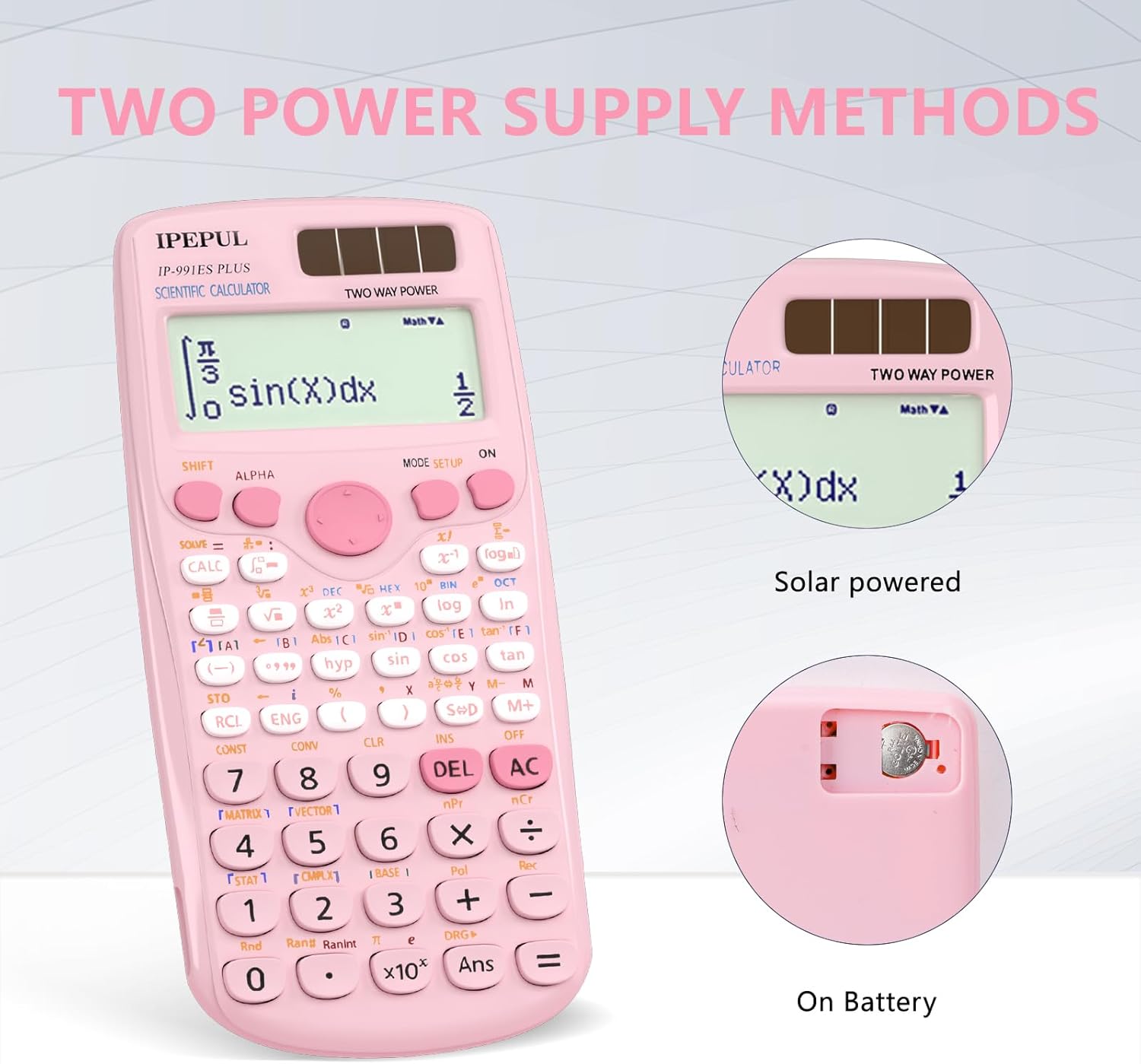 Scientific Calculators, IPepul Pink Math Calculator with 417 Function, Solar Battery Power and 4-Line Display, School Supplies for Middle High College Students Teachers (Pink 991ES Plus)
