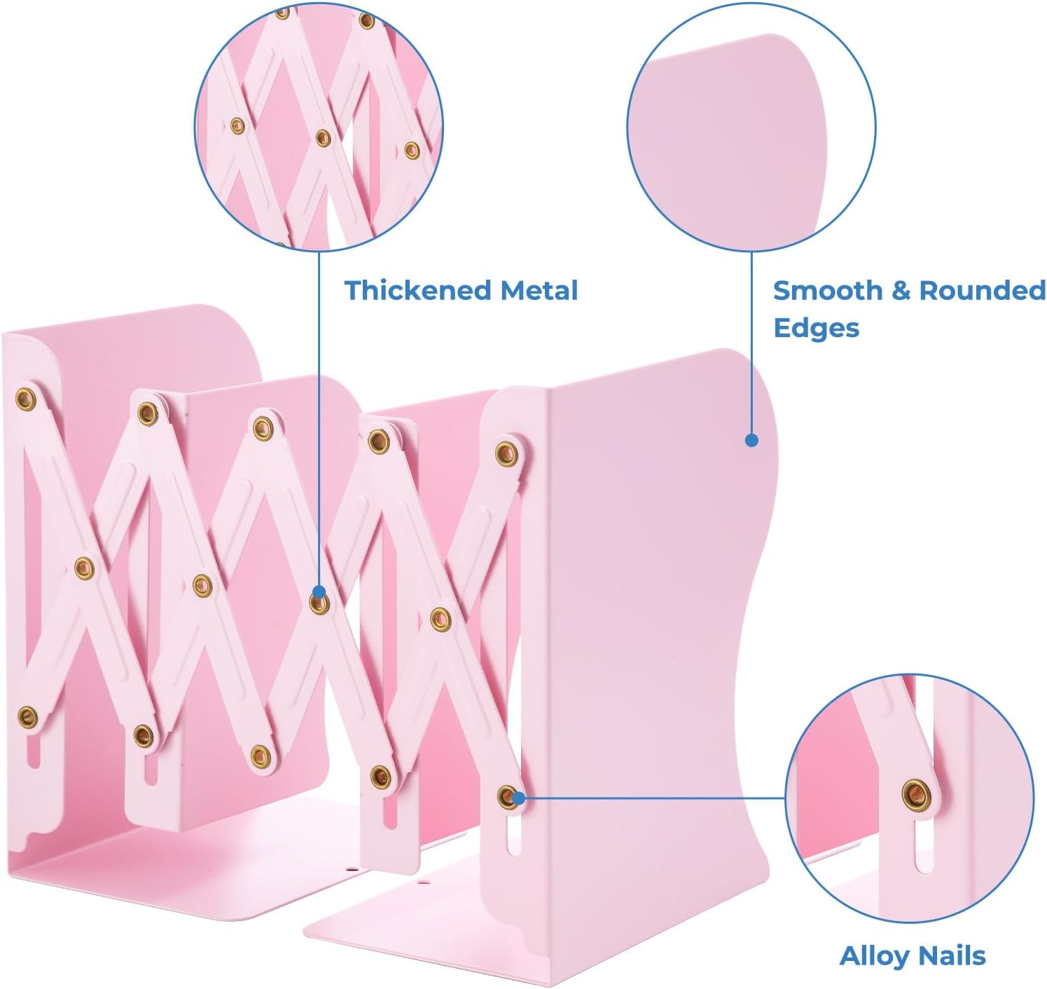 M&G Adjustable Bookends Book Ends for Shelves, Metal Bookend for Heavy Books, Desk Magazine File Organizer Holder Extends up to 20in, Book Stopper for Home, Office, Classroom (Pink)