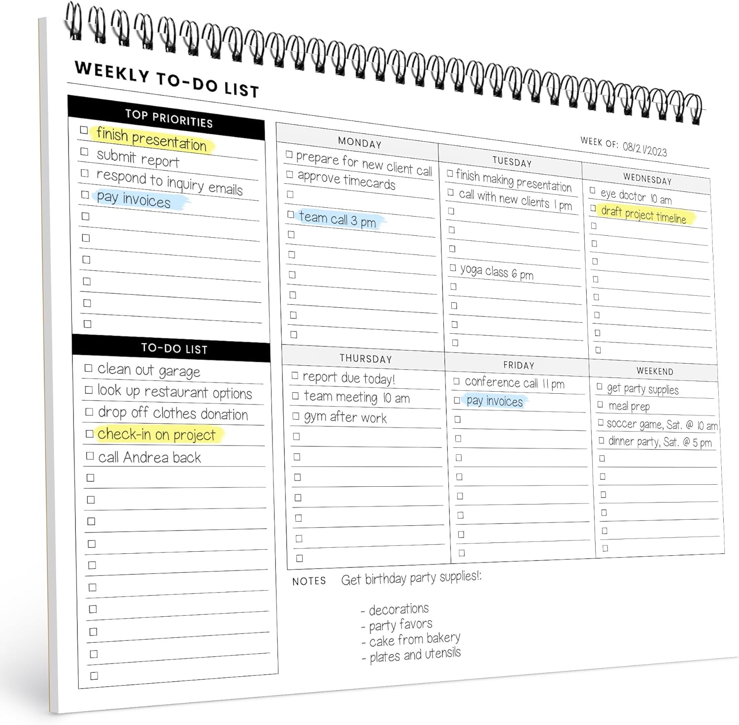 - Style : Weekly To Do List (Spiral)