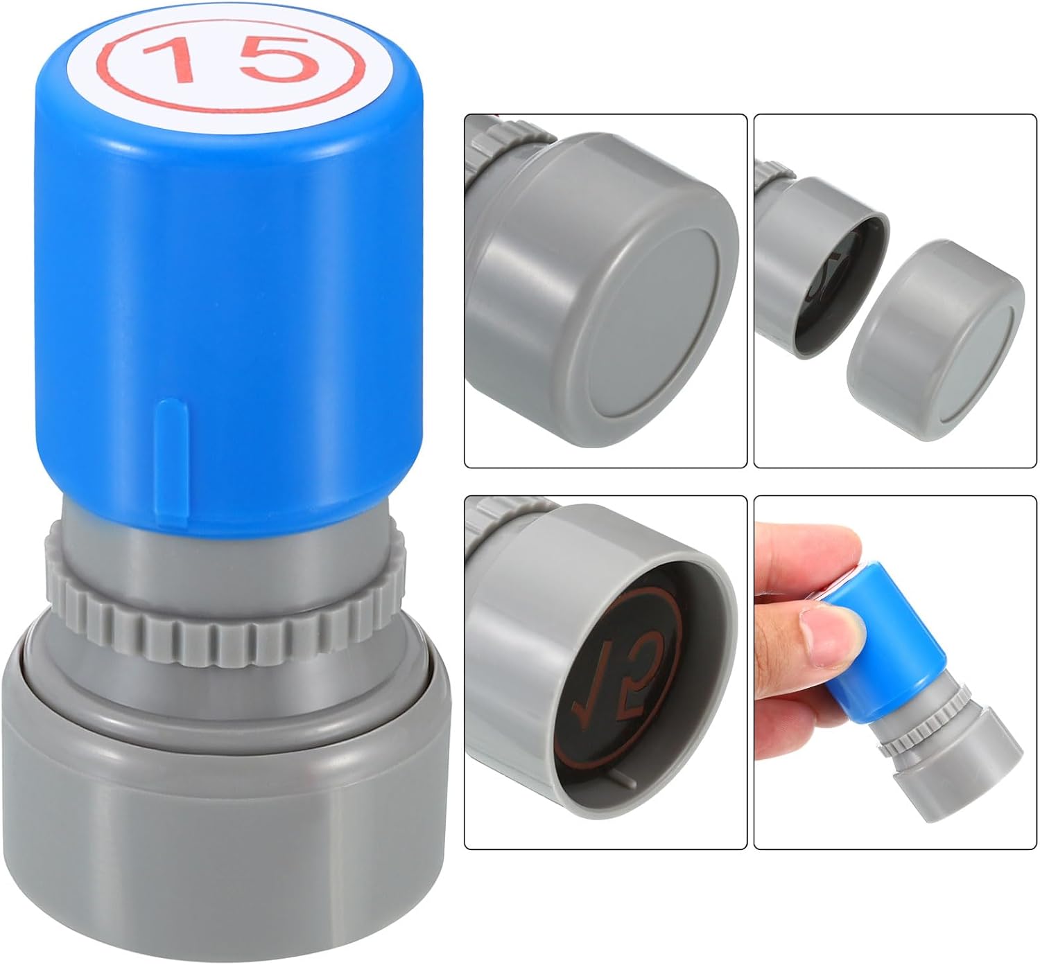 - Ink Color: Red; Shell Color: Blue; Pattern: Digital 15; Material: Plastic; Character Size: 20mm / 0.8 inch; Overall Size: 34 x 63mm / 1.3 x 2.5 inch(D*H); Packing List: 1 x Number Learning Stamp, 1 x Ink