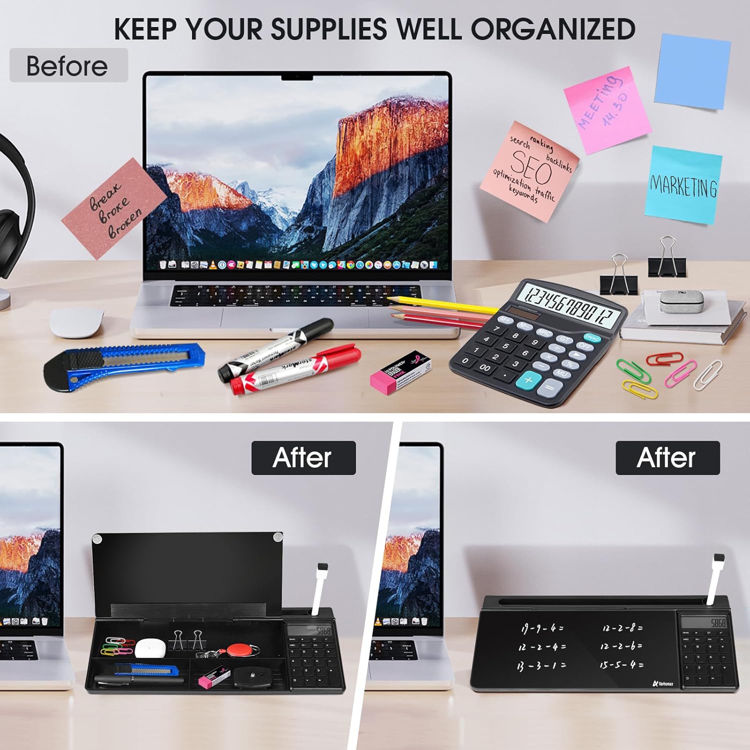 Varhomax Glass Desk Whiteboard Black with Calculator, Desktop Dry Erase White Board with Storage, to Do List Memo Notepad for Home and Office