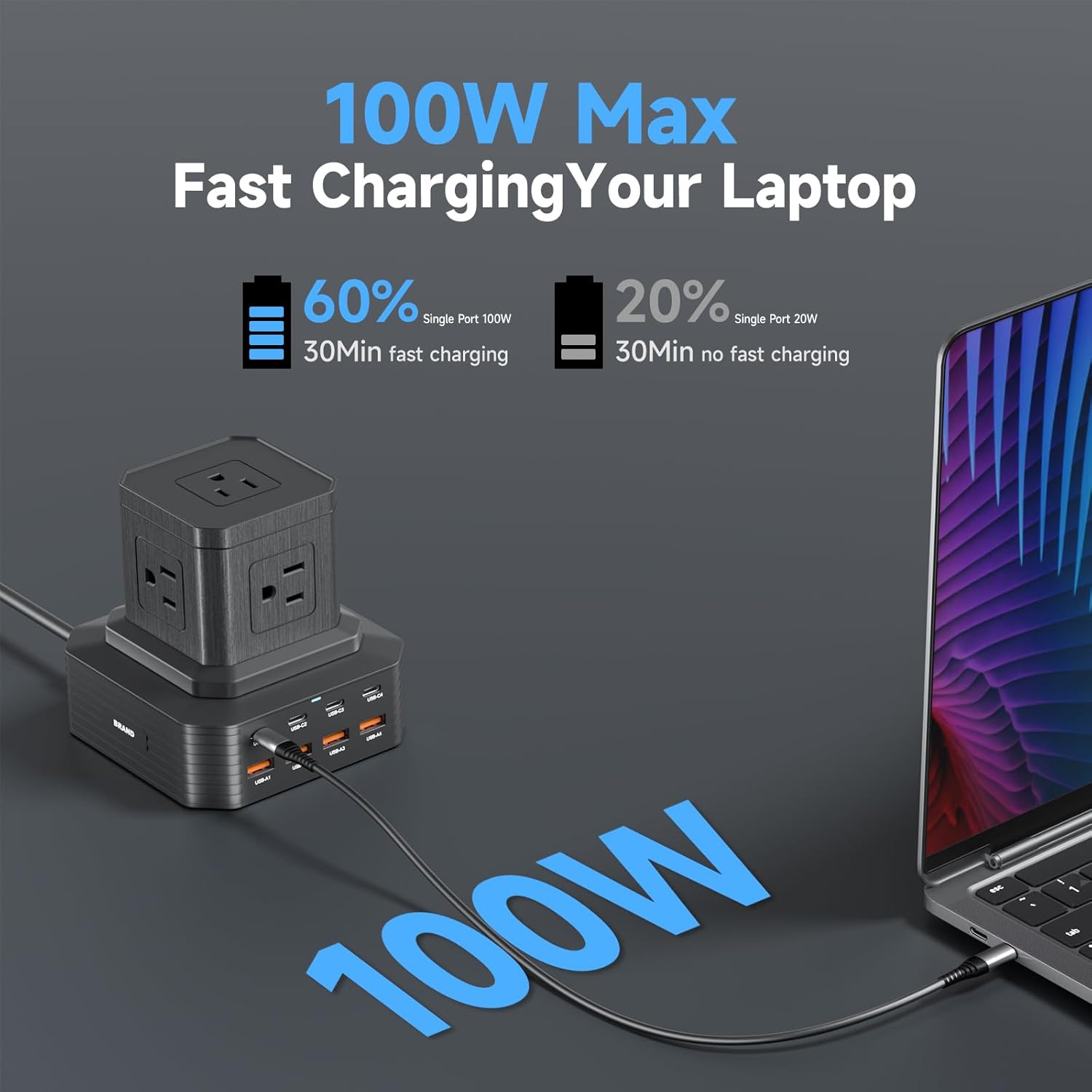 - 【100W Ultra-Fast Charging】This compact charging station with the vertical design, built-in with smart technology, detecting charging devices and deliver optimal charging speed automatically, compatible with most USB devices, Any C port used alone is a 100W output and also comes with a Socket function. Can fit in limited spaces and has a small footprint, perfect for desktop use to help reduce cord clutter, making it an all-in-one solution for your charging needs