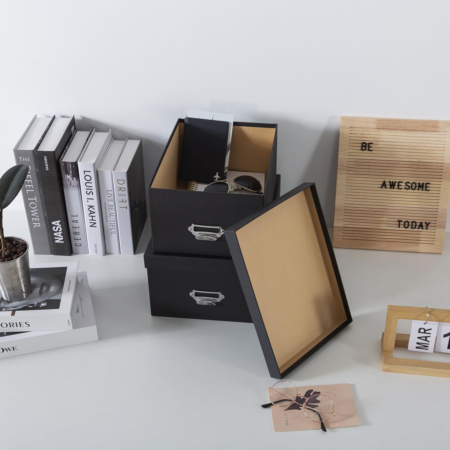 Soul & Lane Black Decorative Cardboard Storage Boxes with Lids, Set of 2 Stacking Keepsake Photo and Memory Boxes for Home & Office, Elegant Paperboard Organizers with Label Holders and Drawer Pulls