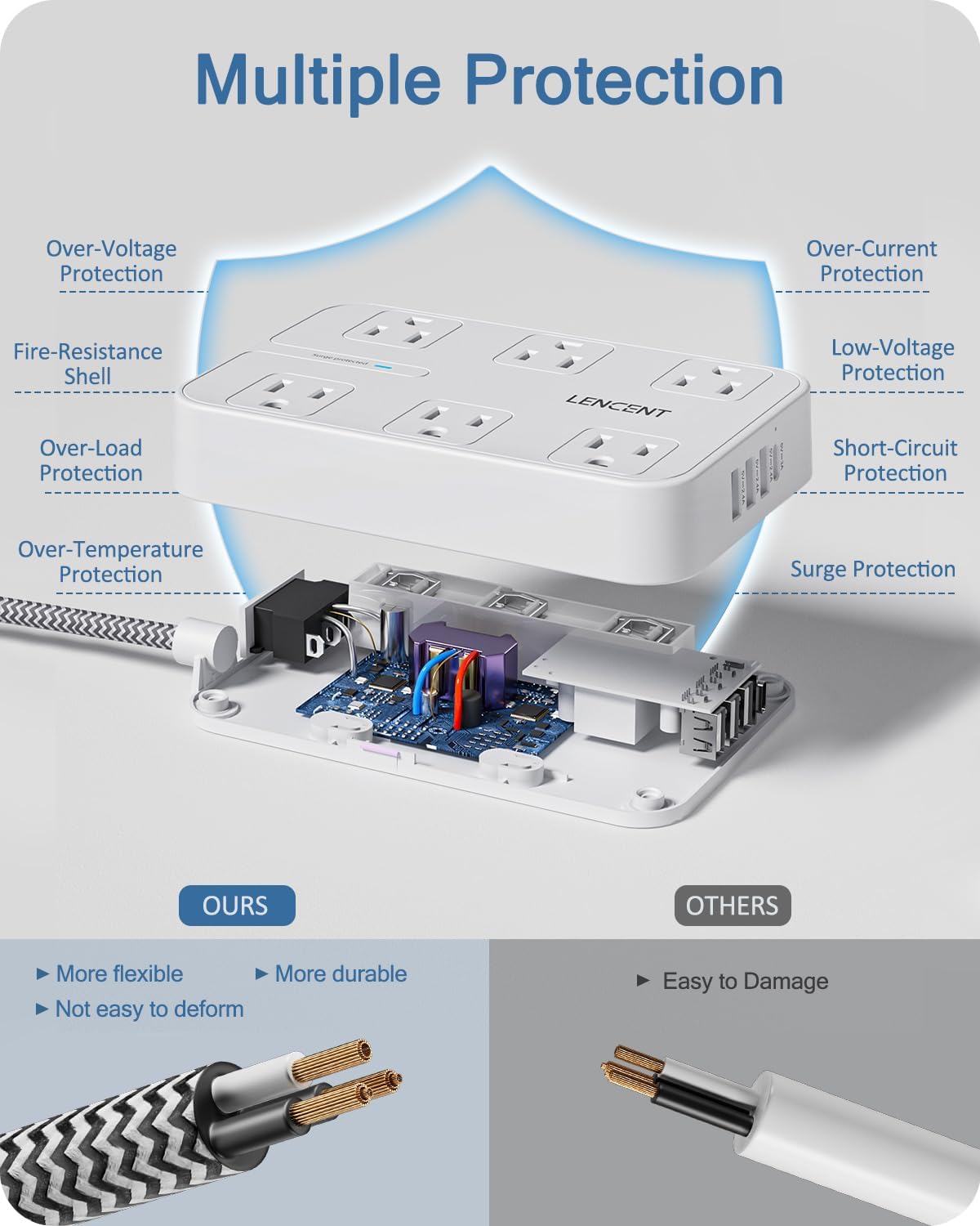 - 10-in-1 Design Charging Station: The 2 prong power strip with 6 AC outlets(1625W Max), 3 USB-A(5V/2.4A 12W Max) and 1 USB-C(5V/3A 15W Max) ports can safely charge up to 10 devices from a single small wall charging unit. The USB ports will automatically detect devices and deliver the optimal charging current to meet your various charging needs. Compatible with mobile phone, tablet, laptop, camera, e-readers and more.