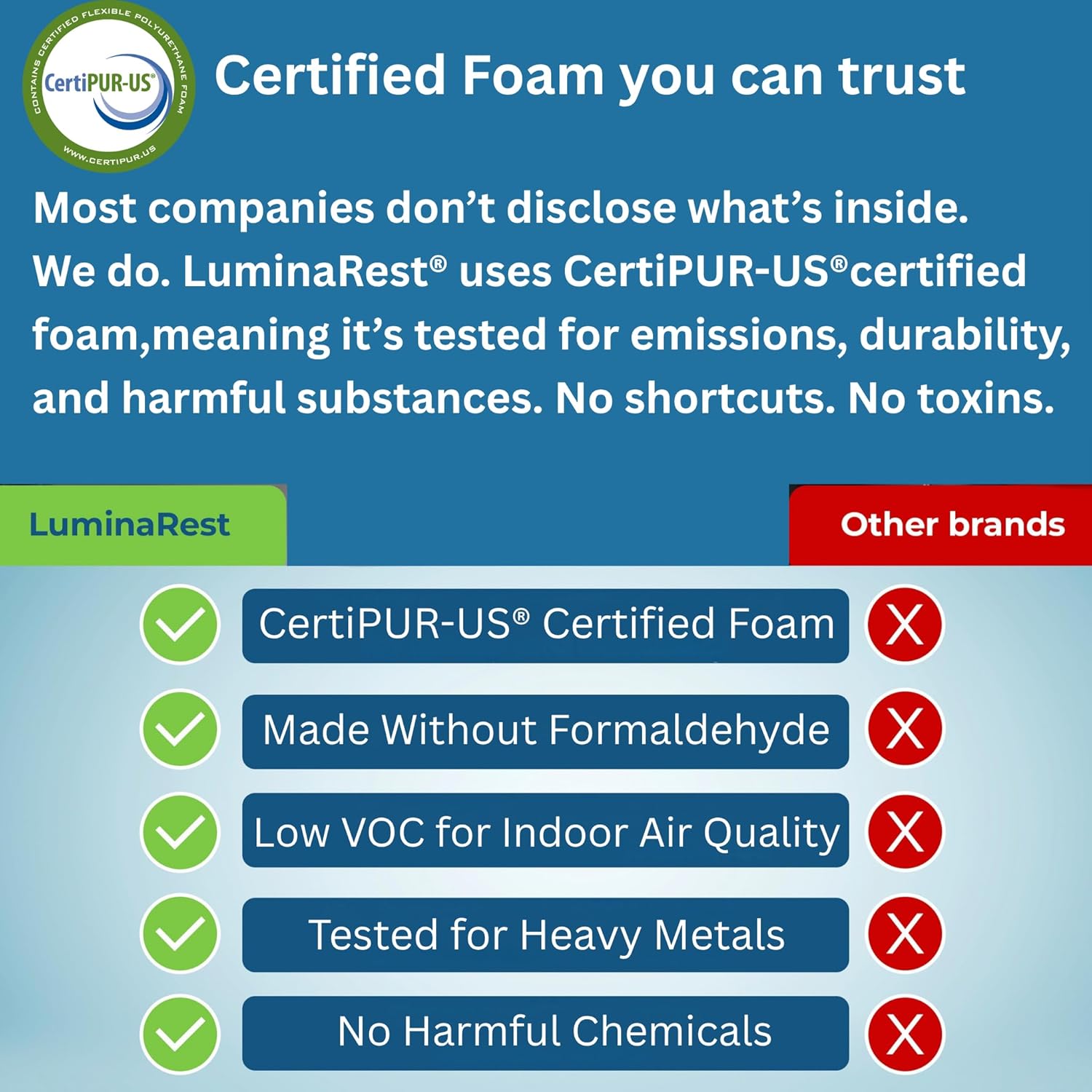 - Authentic CertiPUR-US Certified Memory Foam Gel Seat Cushion – Tested by certified laboratories, LuminaRest Gel Seat Cushion is made without harmful chemicals regulated by the U.S. Consumer Product Safety Commission and without mercury, lead, or other heavy metals. Its advanced cooling gel layer ensures hours of lasting comfort.