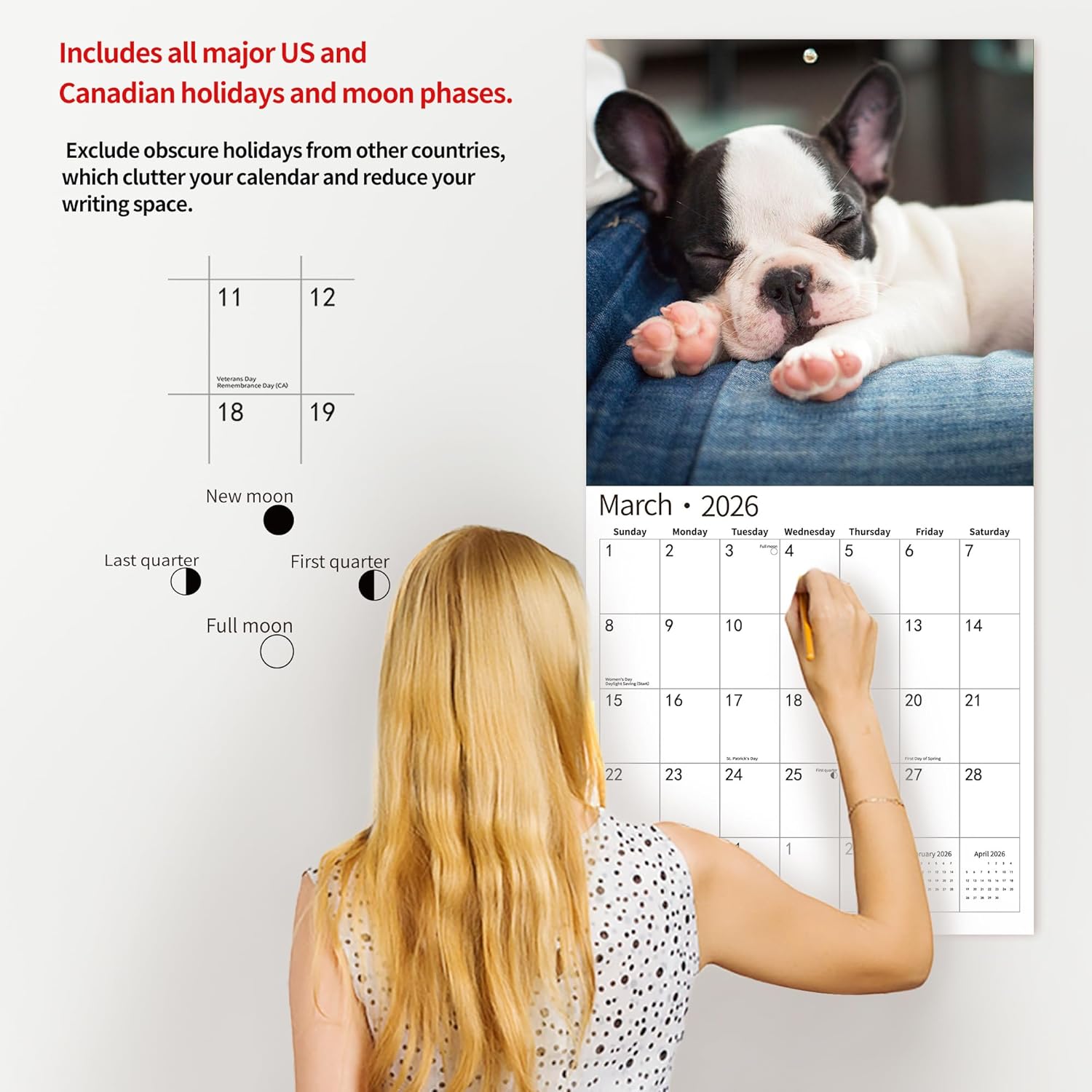 - PROFESSIONAL CONTENT DESIGN - You'll love the feeling of bringing order and organization to your life.Oversized everyday blocks (1.5" x 1.9") give you extra space to jot down tasks and appointments. Includes all major US and Canadian holidays and moon phases. Exclude obscure holidays from other countries, which clutter your calendar and reduce your writing space.Size Closed: 12 x 12 inches.Size Open: 12 x 24 inches.
