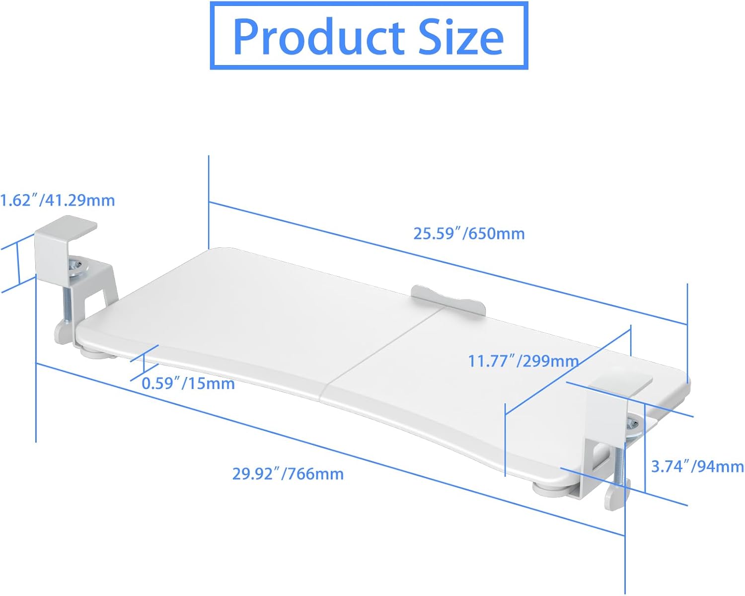 - Universal - This 25.6" (30" including clamps) x 11.8" under-desk keyboard tray holds your keyboard, mouse, and other small accessories below the desktop to add work space. Please not it does NOT fit if your desk thickness is over 1.57”.