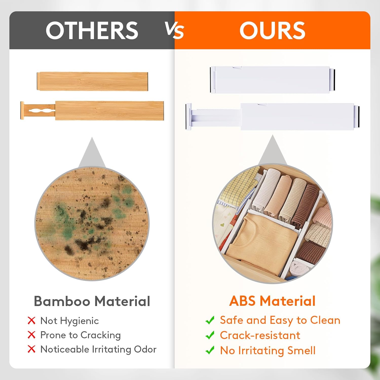- Premium Material: Our adjustable drawer divider is made from high-quality ABS material, which is more sturdy for long-term use and crack-resistant than wooden material. Both ends are designed with premium EVA foam to prevent scratches and damage to the drawer walls
