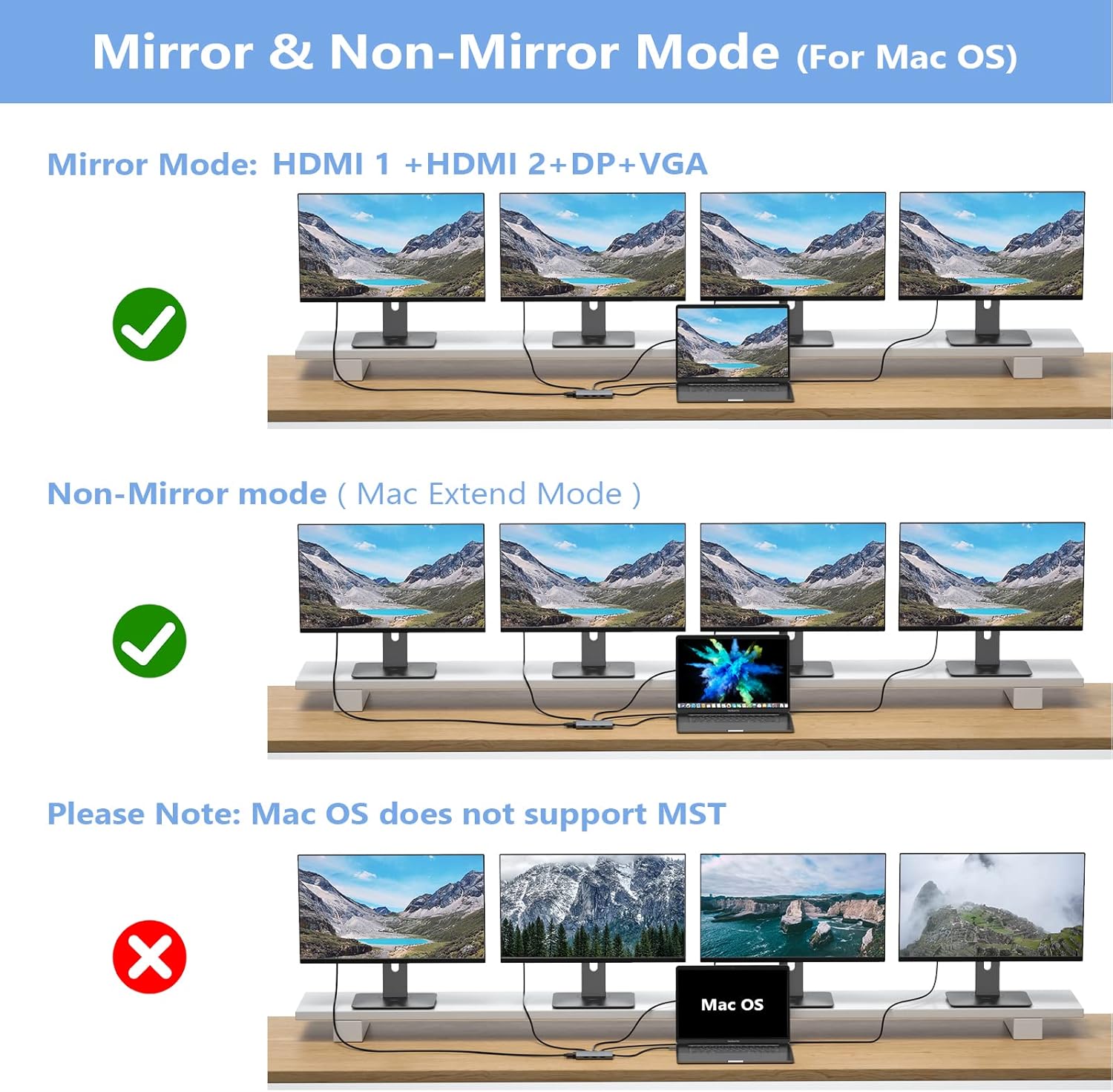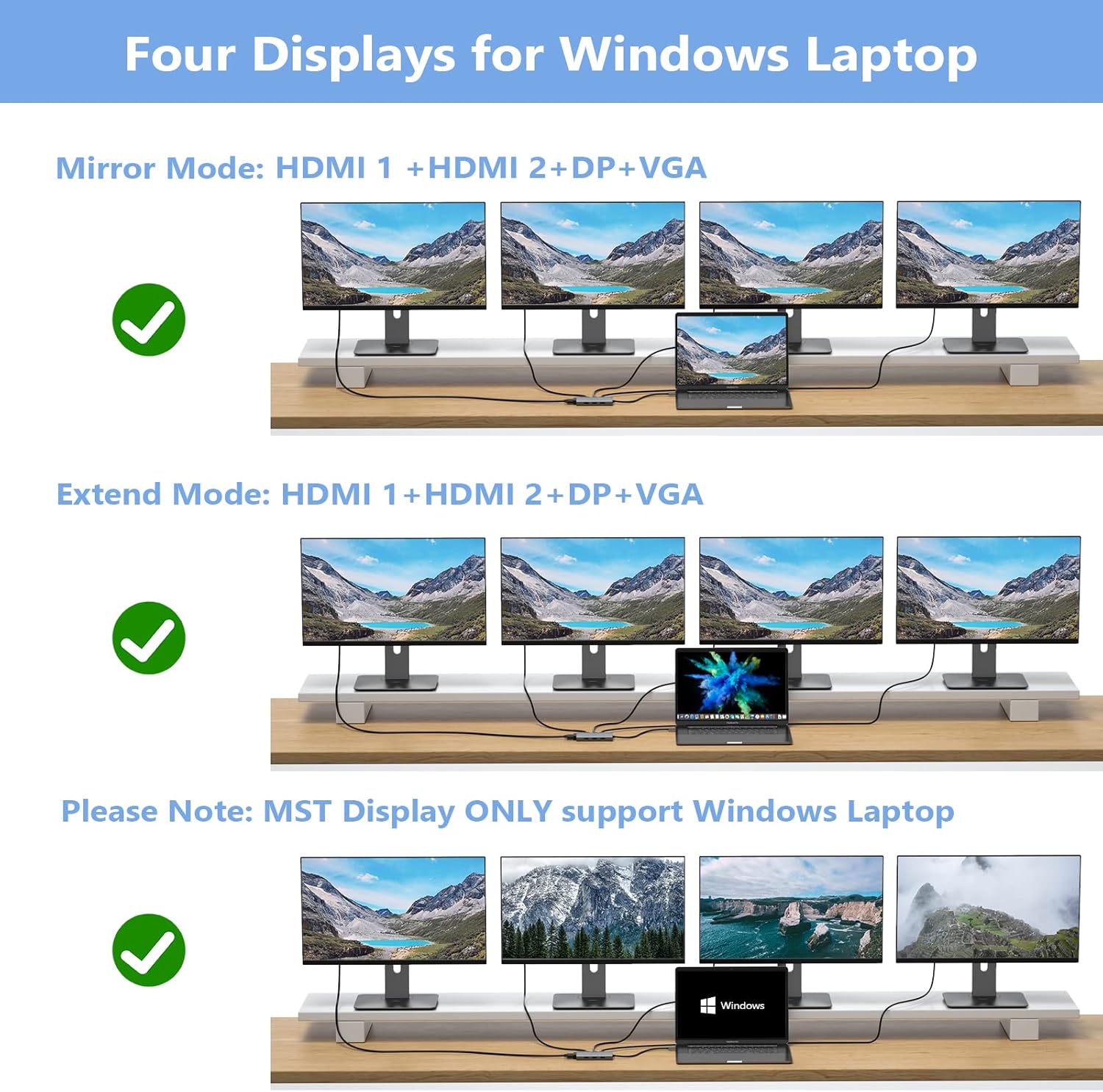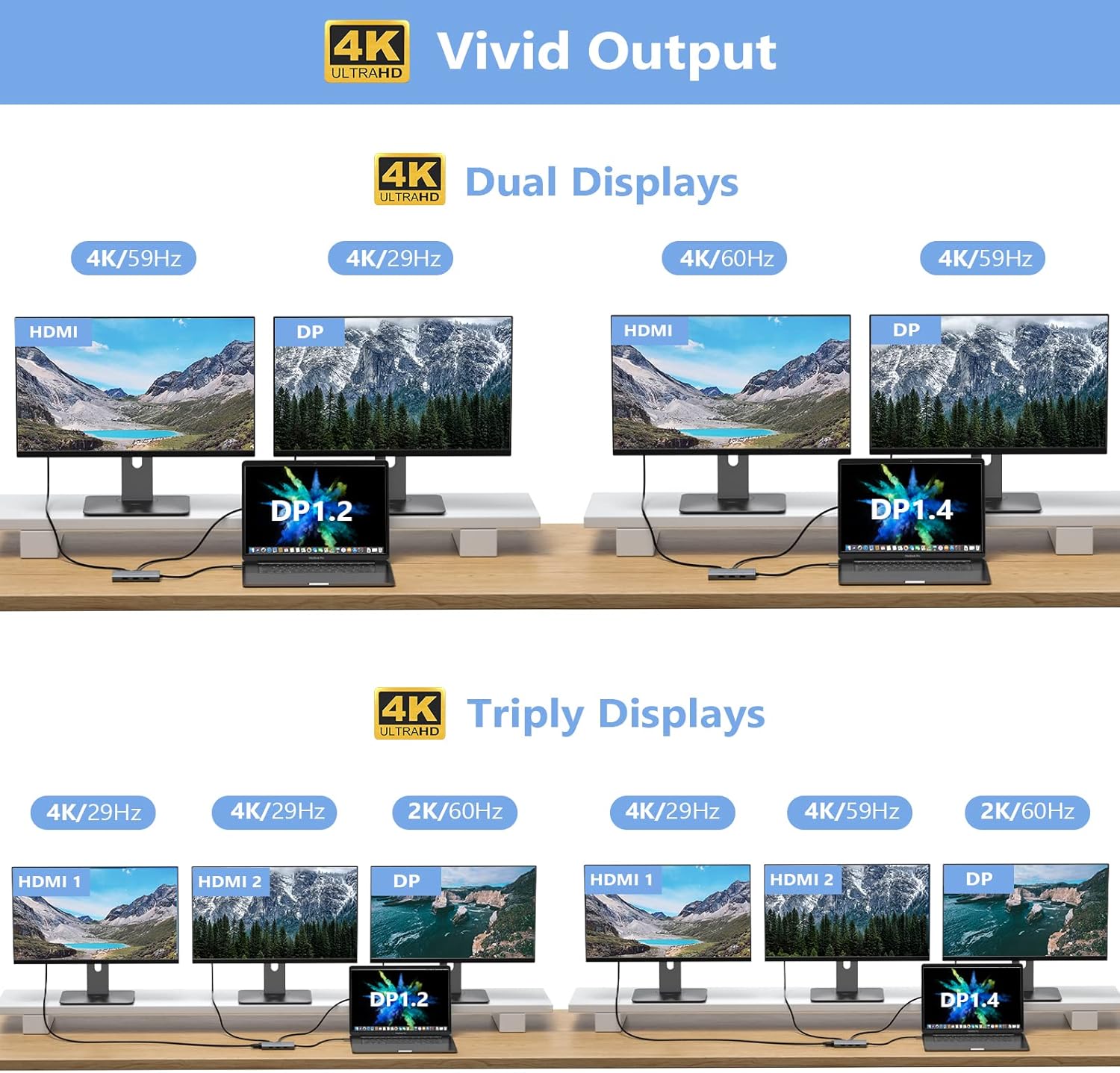 - Docking Station 4K Display Adapter: The Laptop Docking Station with 4 video output ports: 2 HDMI+DP+VGA, can output up to 4K Dual/Triple Display videos; For quadruple display Dual HDMI, DP, and VGA all are 1080@60Hz. Please make sure your laptop specification support DP1.4 signal output. If the VGA port is connected, it will affect the resolution of all displays up to 1080P only