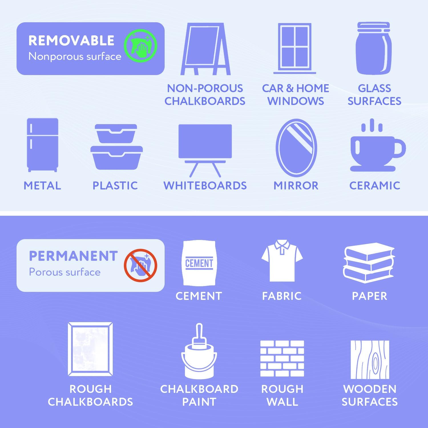 - Easy to Clean: When you’re ready to write & start fresh, a mere wipe of a wet paper towel will remove your erasable chalk markers completely and easily from almost any non-porous surface