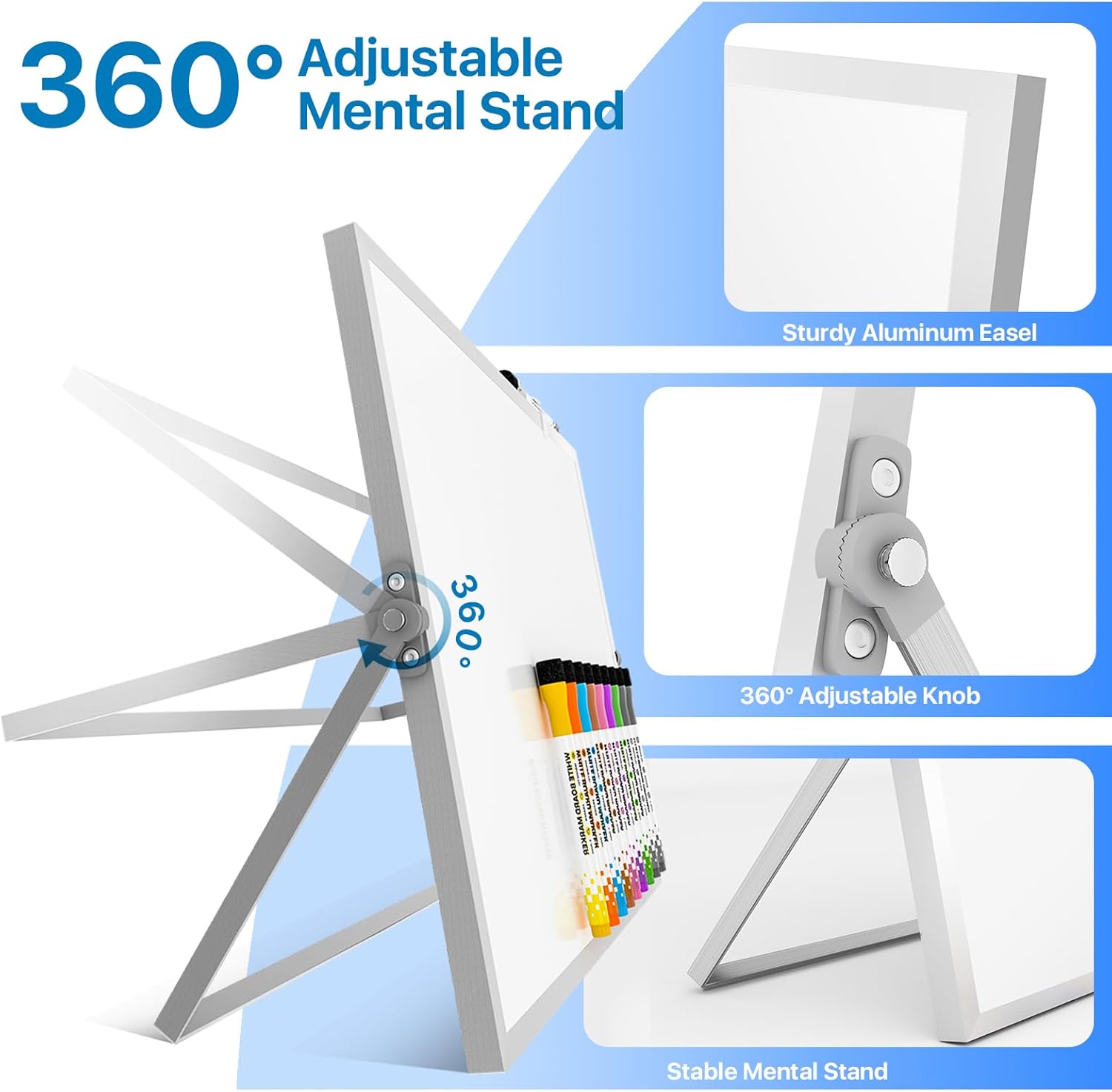 - Portable Dry Erase Whiteboard with Stand; This magnetic desktop whiteboard is lightweight enough for you to take it anywhere. 360° adjustable knob makes it possible for you to adjust the the placement angle you want. The newly upgrade reinforced gear allows the dry erase board to stand stably at all angles. So you can make it place the way you like, convenient for you to write and hold.You can lay it down as a flat whiteboard, or make it stand on a desk