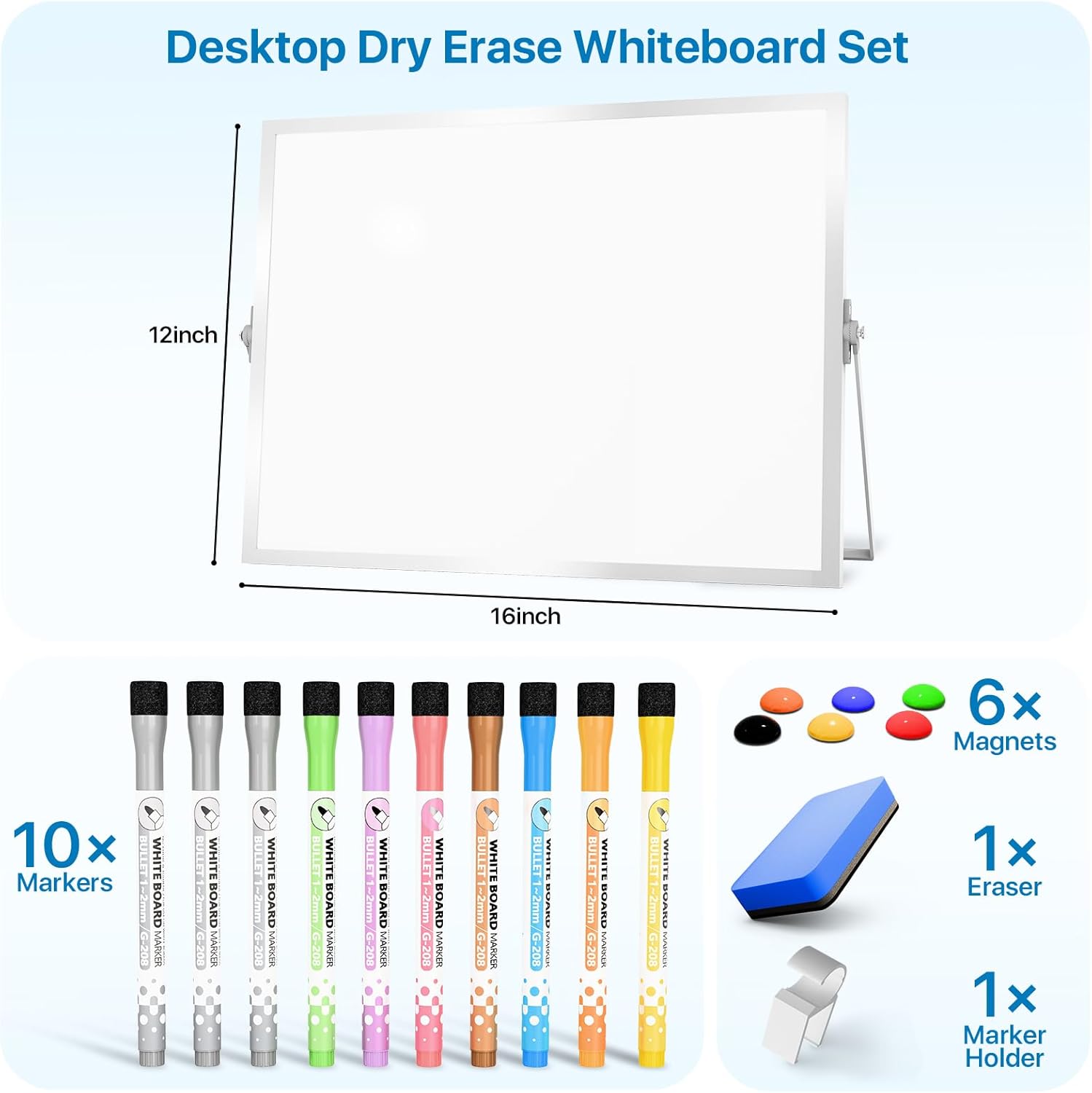- Dry Eraser Whiteboard Kit; The whiteboard kit includes 10 Markers of 8 colors, 6 Magnets,1 Eraser, 1 Pen Clip. Both surfaces of the desktop dry erase board are made of smooth and durable materials,easily to write on and wipe off without stain. It also has a duty aluminum frame supplying a very good protection for the desktop whiteboard. This dry erase board is very durable and resistant to drops