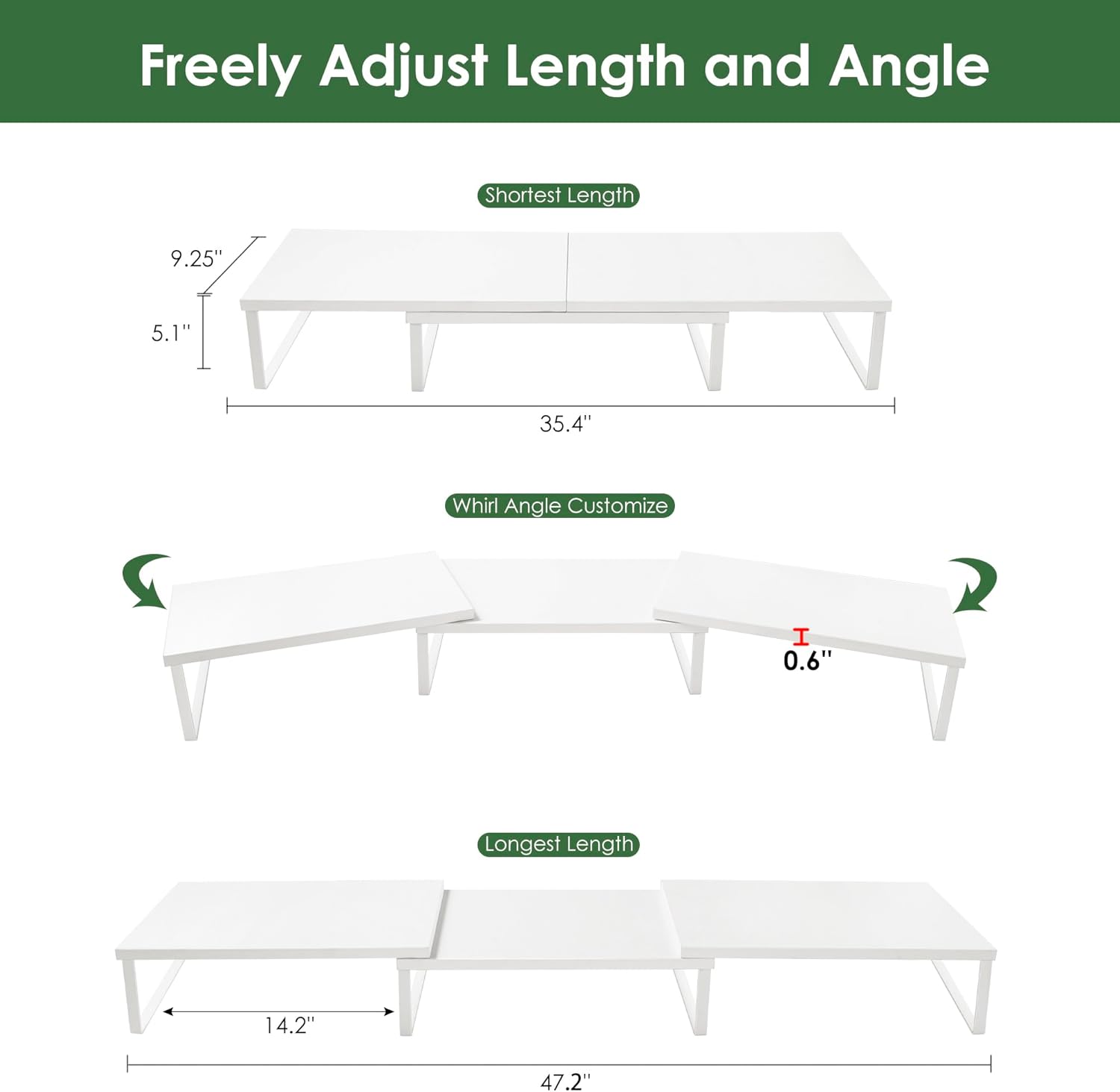 - Adjustable Angle & Length:The length of monitor stand riser with drawer can be adjusted from 35.4 to 47.2 inches, and angle can be adjusted +/-90 degree to meet various office needs and obtain a better viewing experience. If you need multiple computers to work at the same time, you might as well choose our extra large monitor riser for 2 monitors.