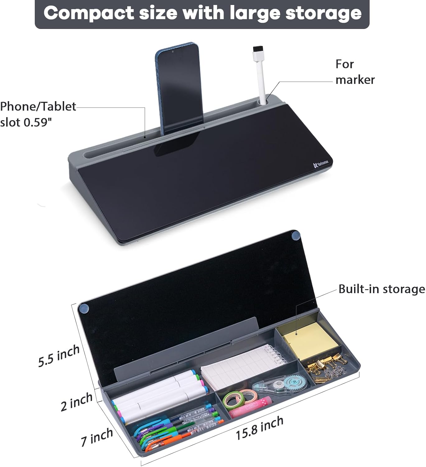 - Built-in Storage: No more clutter on your desk with the inner compartments for storing your supplies like pens, pencils, dry erase markers, paper clips, keys, glasses, and even phones, scissors, staplers, etc. Declutter your desktop and keep it neat and clean