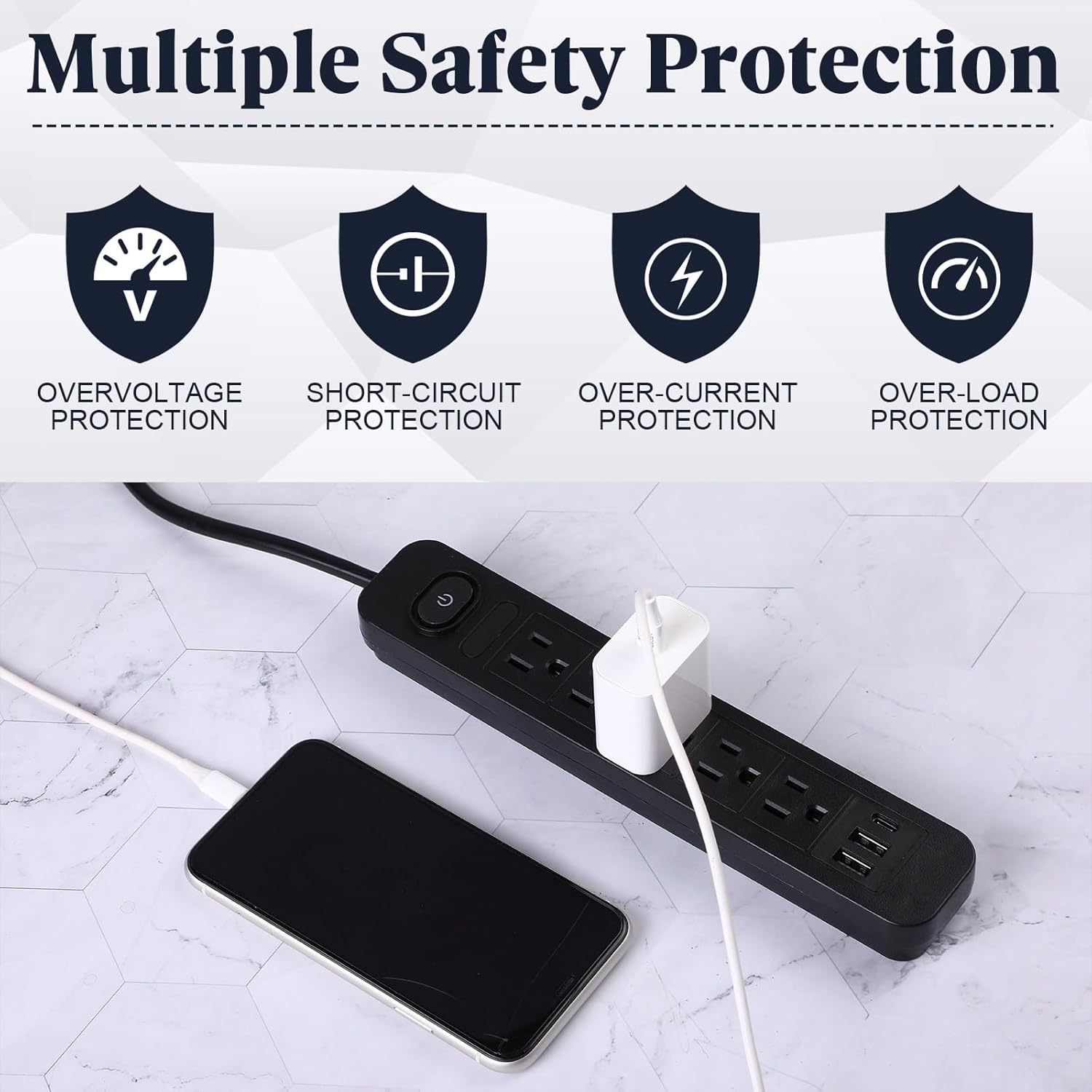 - Overload Protection: to keep your device from power surges, overheating, overloading, and overcharging, the power strip with USB ports has an illuminated 15 amp circuit breaker; This ensures the safety of your devices by automatically shutting off when the power load exceeds its capacity