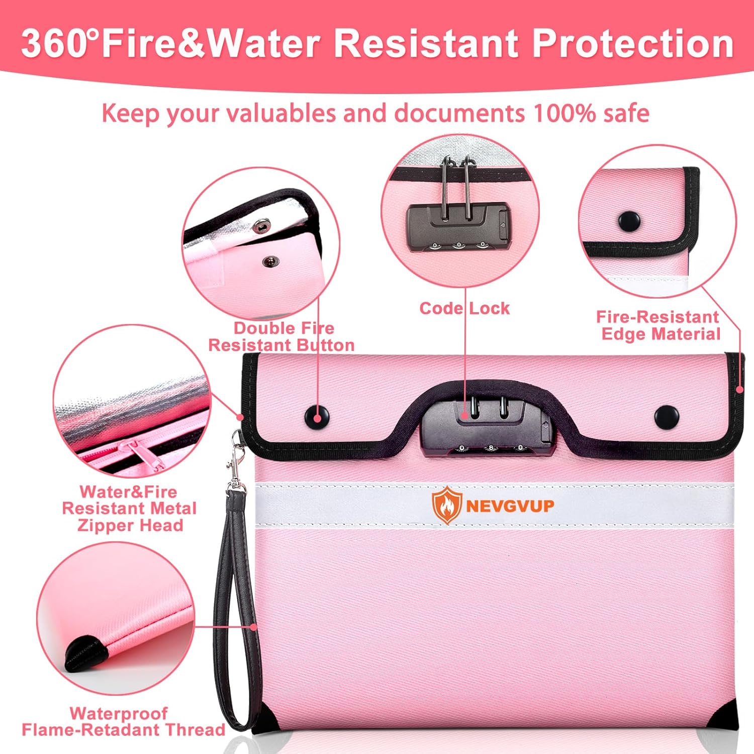 - 360° Fireproof Design: This NEVGVUP fireproof document bag mainly adopt a 9-layer function material structure of fire protection and heat insulated; The fireproof money bag for cash is sewn with flame-retardant thread and fireproof hemming, to prevent fire from damaging the fireproof bag from the edge, closure by velcro flap, plus two fireproof metal snaps, so that its zipper completely prevent fire, which make the fire proof money bag for cash 360° fire resistant
