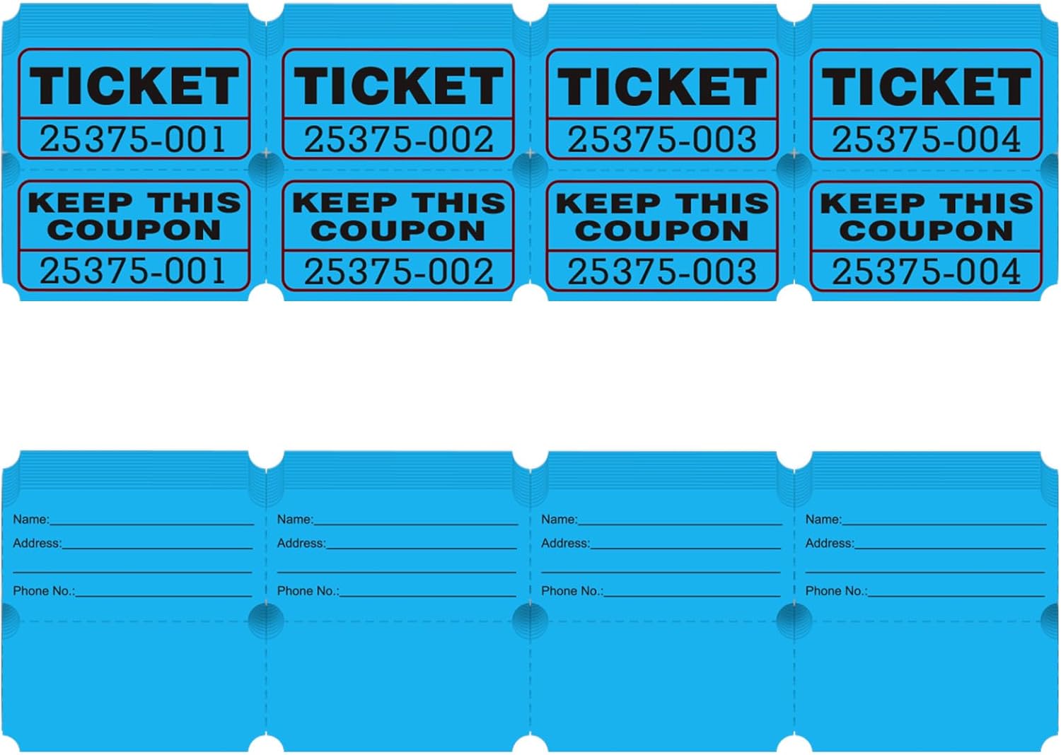 - The blue colored raffle tickets are consecutively numbered and perforated, making it easy to tear off multiple tickets at once. The large numbers are easy to read and there are duplicate numbers for tracking purposes.