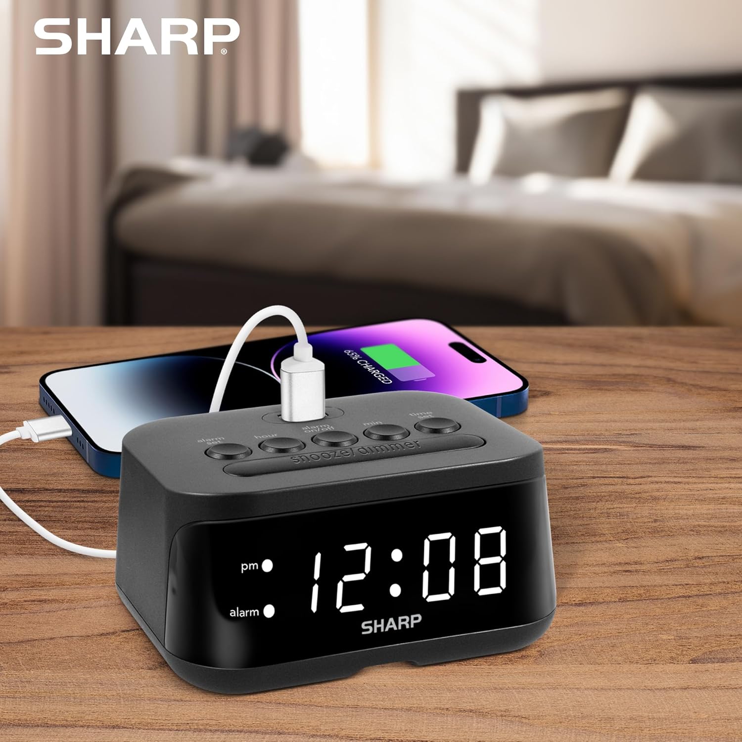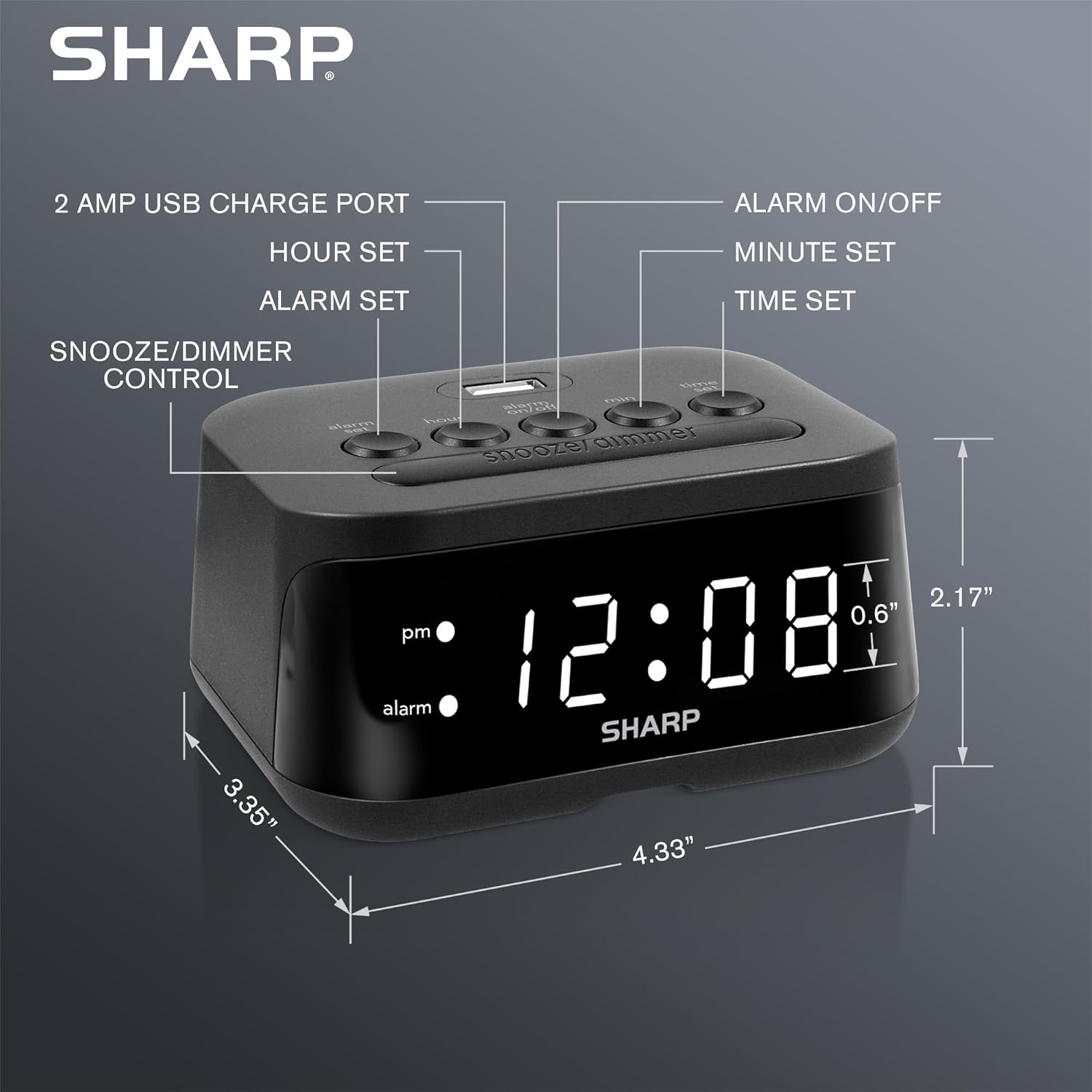 - Wake Up on Time with the Digital Alarm Clock with USB Charge Port from Sharp (SPC235ABAMZ). The versatile alarm clock conveniently has a FastCharge USB charge port that charges at a Fast 2 AMP speed. The charging port is located on the top of its case where it is easy to access and easy to use and can be used to charge your smartphone or other devices. The small size is a perfect fit for your nightstand, desk, kitchen, home office. Additional accessories shown are not included