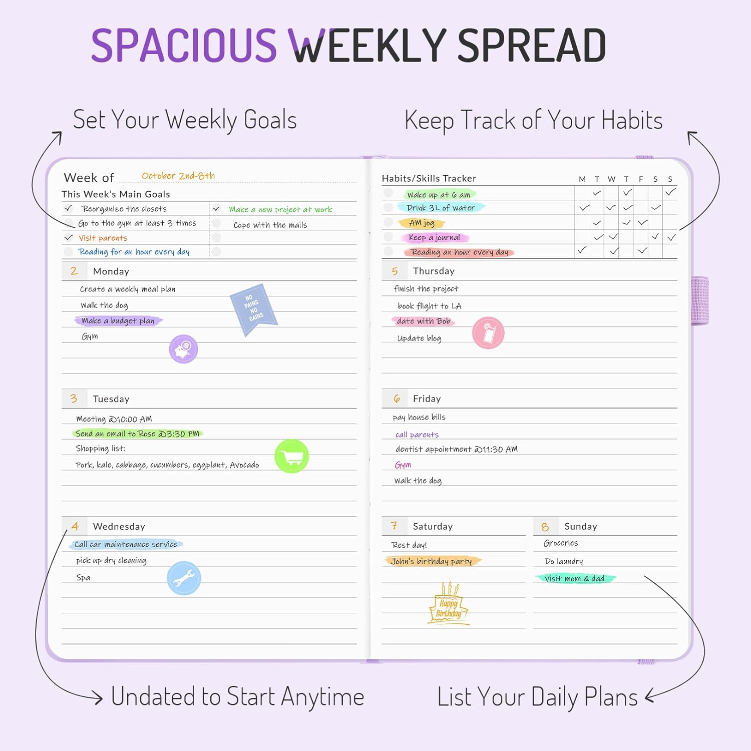 - Monthly Calendar & Weekly Planner: Each monthly spread with large date box helps you easily mark appointments, agenda, important dates, bills due, etc. Weekly two-page spreads provide generous lined writing space for more detailed planning, helping you keep track of daily tasks and develop habits or skills.