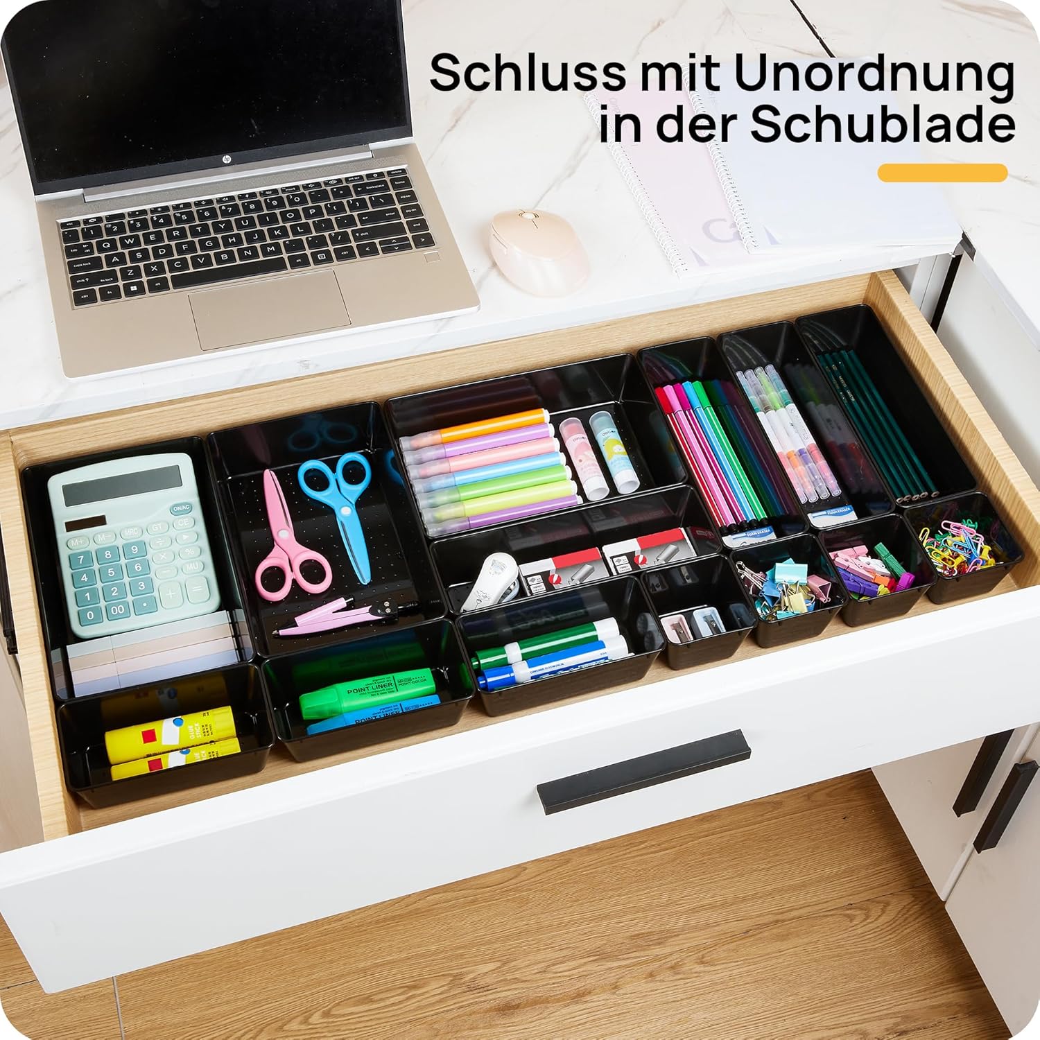Vtopmart 25 PCS Office Desk Drawer Organizers Set, 4-Size Versatile Plastic Drawer Organizer Trays, Storage Bins for Desk Accessories Office Organizers and Storage, Bathroom, Makeup, Vanity, Black