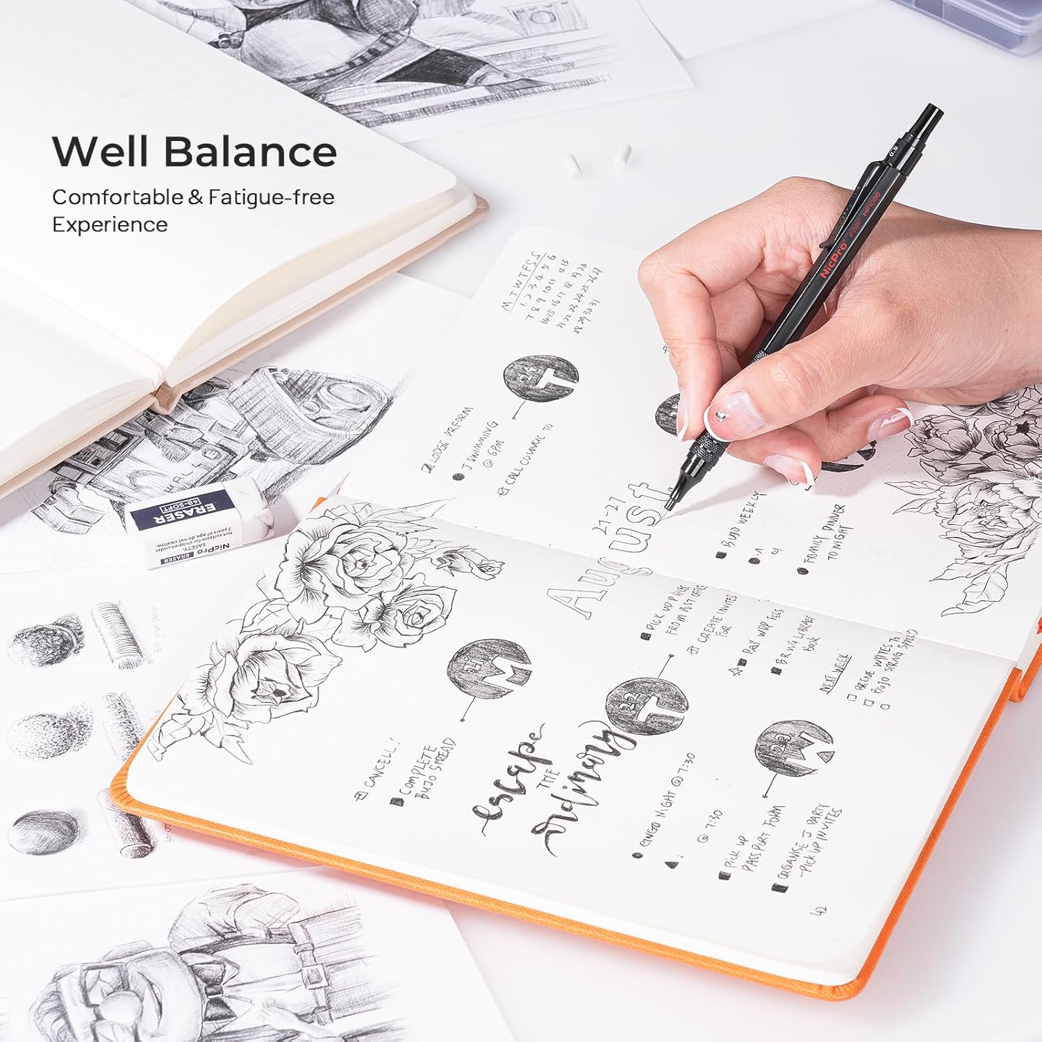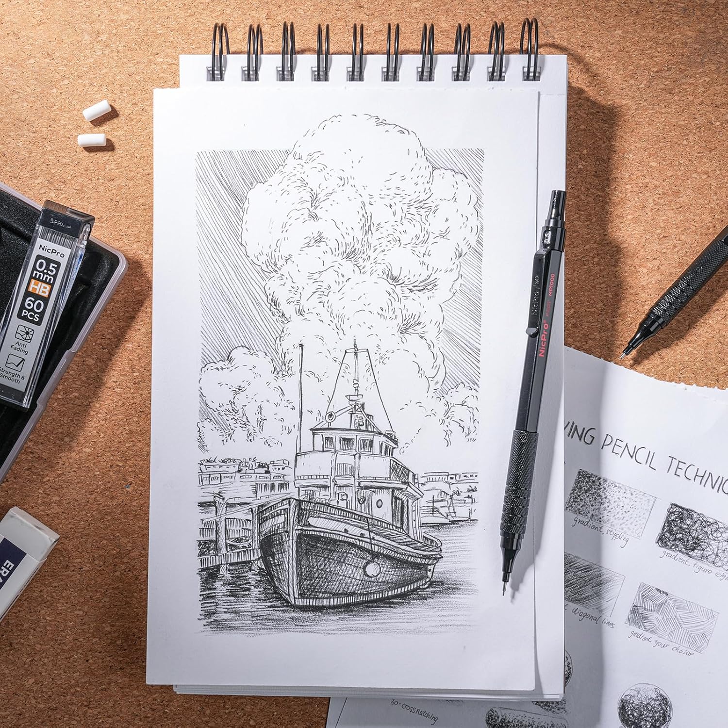- Nicpro MP1000 Series Pencil: Come with 6 pcs of 0.5, 0.7 & 0.9 mm mechanical pencils with 12 tube of HB & 2B pencil lead, 3 pcs 4B-soft erasers, 18 pcs mini cap eraser refills in a storage case