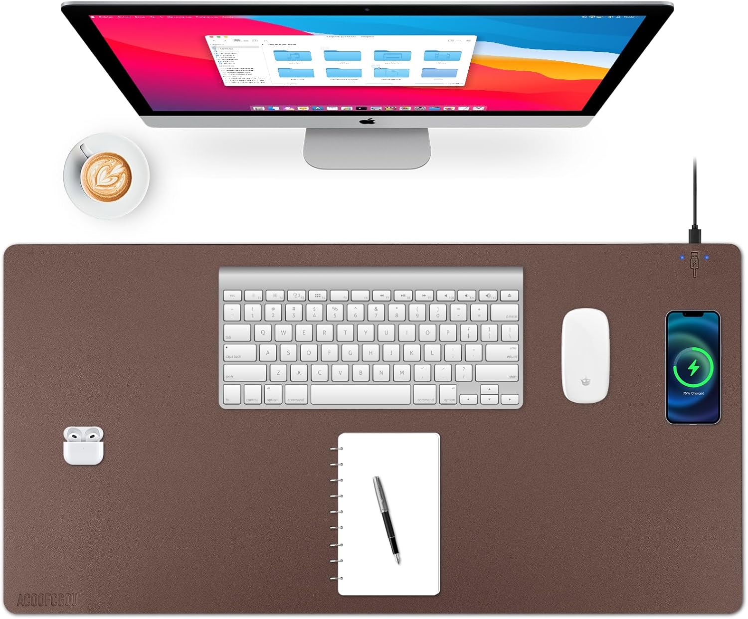 Wireless Charging Desk Mat with Desk Pad for Desktop Charging Large Mouse Pad Waterproof Leather Computer Mat Mouse Pad Non-Slip Protector on Top of Desks for Keyboard and Mouse (brown-r, 32*16inch)