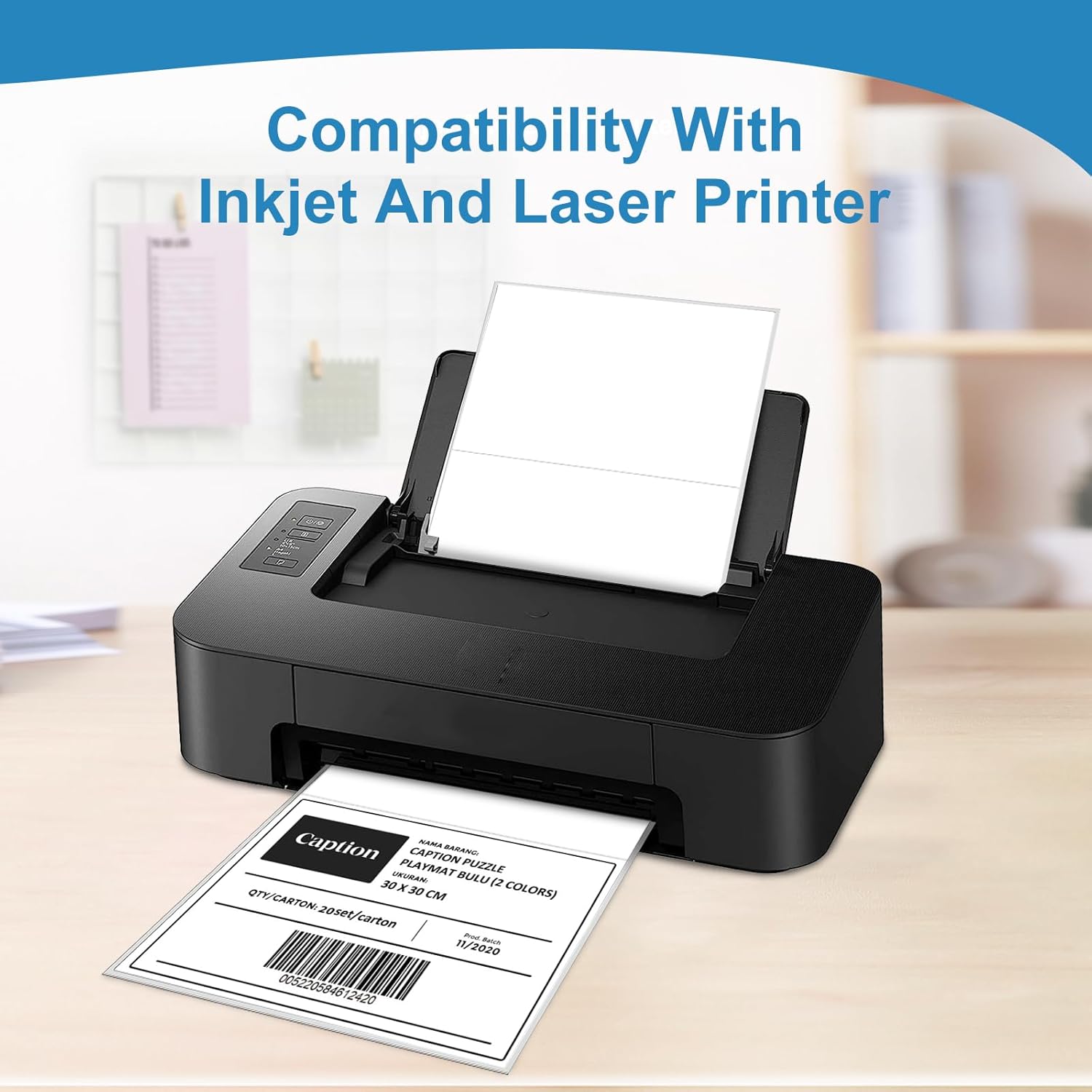 - Versatile Usability: 8.5" x 5.5" label paper is perfectly compatible with Laser/Ink Jet printers. Without causing paper jams. Design versatile paper stickers and shipping/product labels that adhere securely to a wide range of surfaces including metal, plastic, glass, tin, cardboard, and more