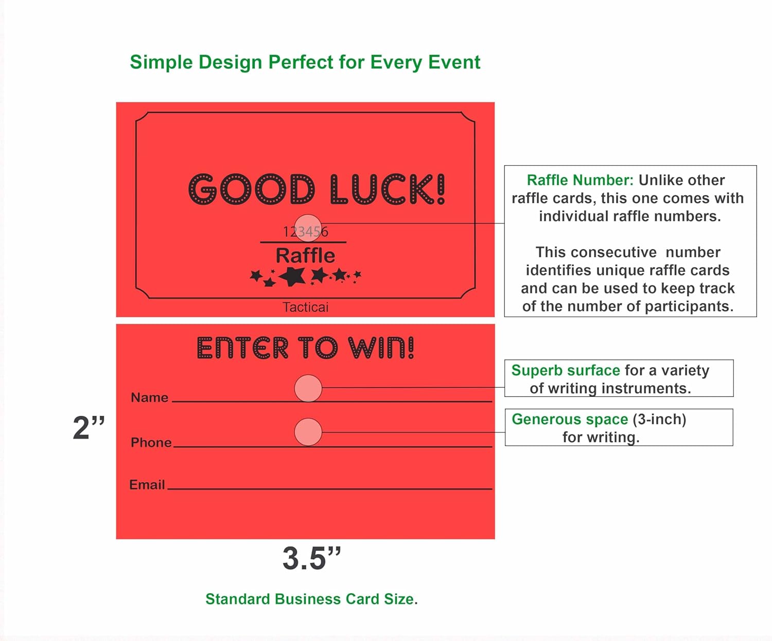 - RAFFLE OPTIONS – Each pack contains 250 raffle cards that can support small, medium, and large events. Easy to write for collection of name, phone number and email address. Each ticket is 3.5” x 2”.
