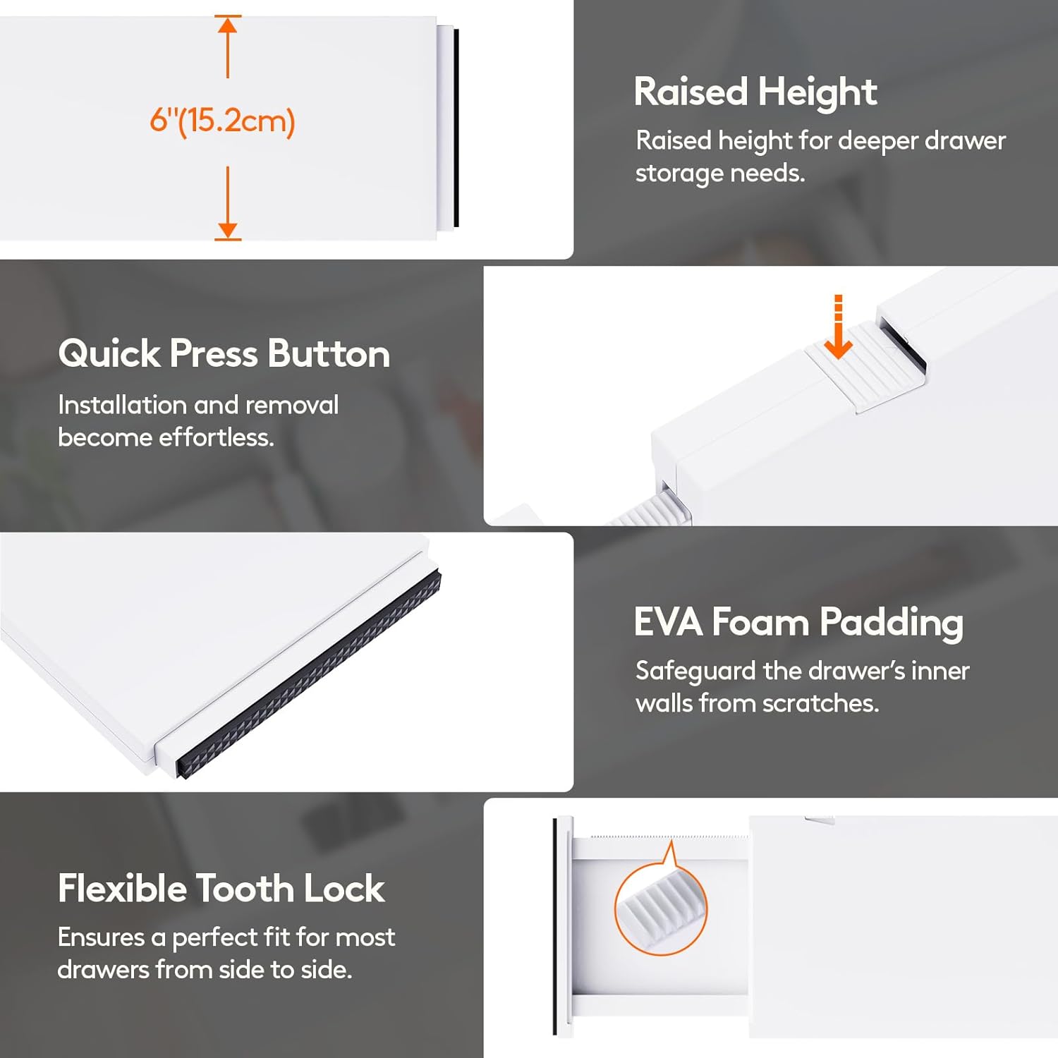 - Easy to Install: To adjust the length, press the top button before placing the drawer organizer, and then stretch it out again to secure it tightly. The strong spring tension keeps each organizer upright and secure. When retracting, press the top button and push in the stretched side.