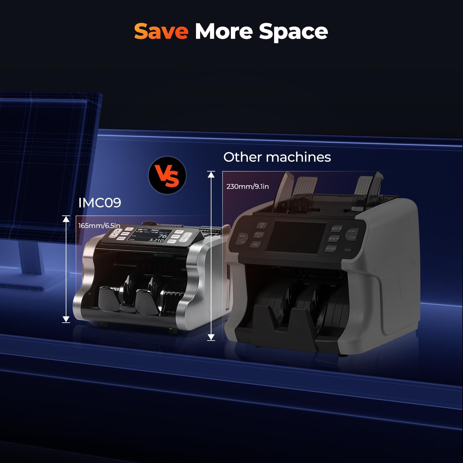 - [Fast and Smooth] The IMC09 cash counter machine has a counting speed of 1000 bills per minute. Upgraded roller processing for old bills provides an advantage for counting creased bills. The currency counter can count up to 200 bills in a single run.