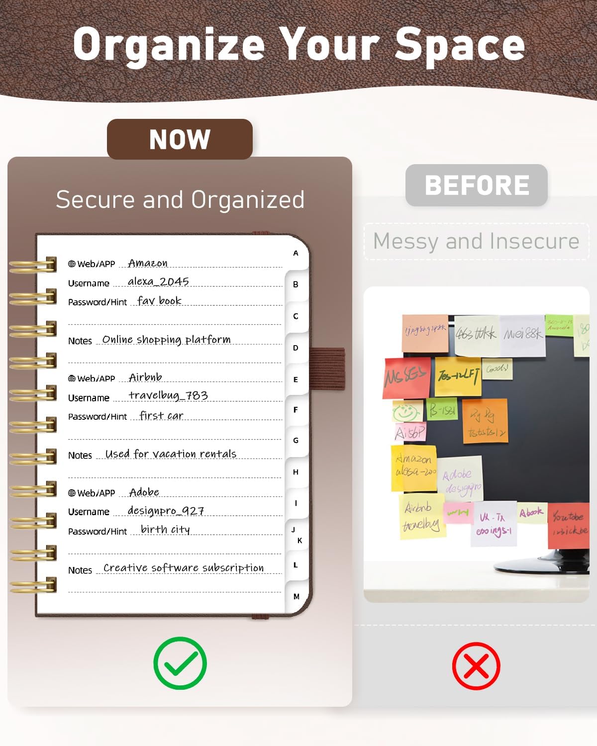 WEMATE Password Book with Alphabetical Tabs, Spiral Password Keeper Book for Seniors, Internet Password Notebook Password Journal Logbook Log in Detail, Small – 4.7''x 6'' (Brown)