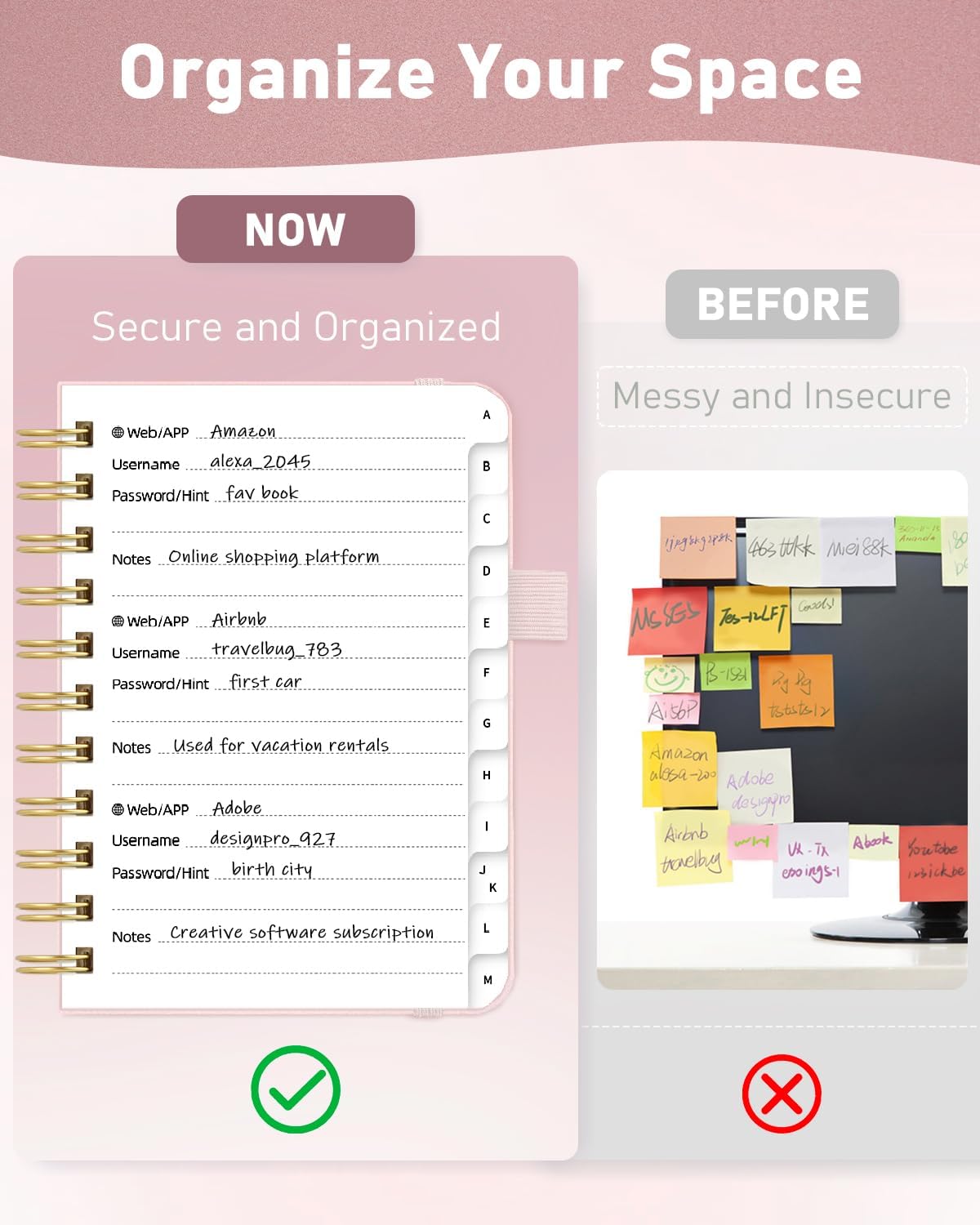 - Master your passwords with Alphabetical Tabs: 24 sections, each storing up to 18 passwords; Ample writing space to update and secure passwords; Add personal hints and notes for extra security; # Index tabs for frequently used passwords; Plus, lined note pages for convenient note-taking